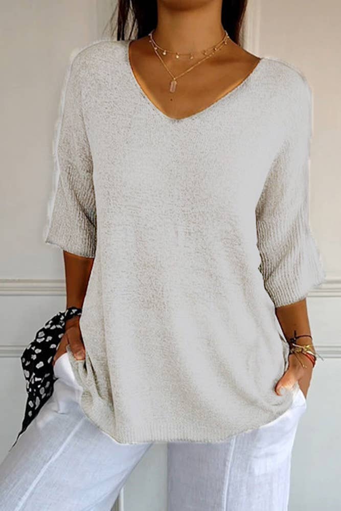 So comfy with an effortless boho silhouette, the On The Go V Neck Ribbed Essential Tee is a must-have! A boho essential because: * Comfy and stretchy ribbed knit fabric that moves with you all day long * Relaxed and loose silhouette with a flattering v-neckline * Dropped shoulders with 3/4 length sleeves for a laid-back and relaxed vibe * Mini side slits along the side for added comfort and style *Due to lighting and differences in monitors, actual colors may vary slightly from what appears online. Model is 5'8" and wearing a size Small. Approximate measurements are as follows: * SMALL: Bust: 56", Waist: 56", Hip: 56" , Length: 25", Sleeve length: 16" * MEDIUM: Bust: 58", Waist: 58", Hip: 58", Length: 26", Sleeve length: 17" * LARGE: Bust: 60", Waist: 60", Hip: 60", Length: 27", Sleeve length: 18" * X-LARGE: Bust: 62", Waist: 62", Hip: 62", Length: 28", Sleeve length: 19" * 96% Polyester, 4% Spandex * Hand wash cold, Lay flat to dry * Made in USA