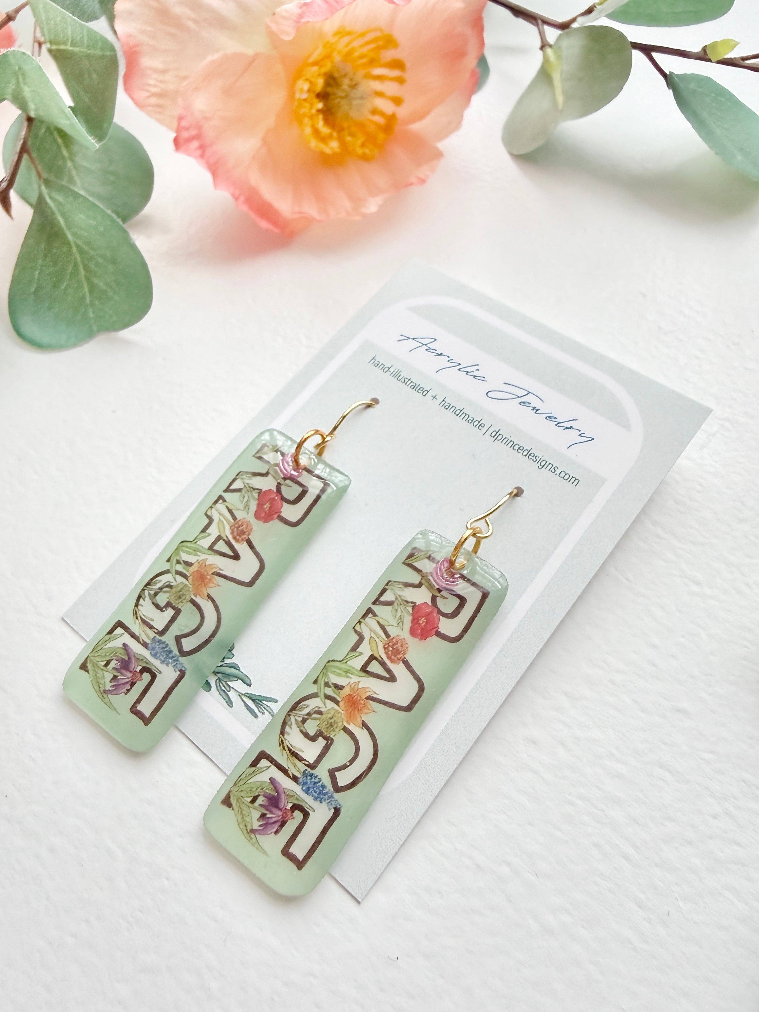 These handmade acrylic, resin, and gold plated dangle earrings are handcrafted from an original D. Prince Designs illustration. Your jewelry will arrive protected in a cellophane sleeve, ready to gift or enjoy! ~Handmade in Philadelphia, PA~