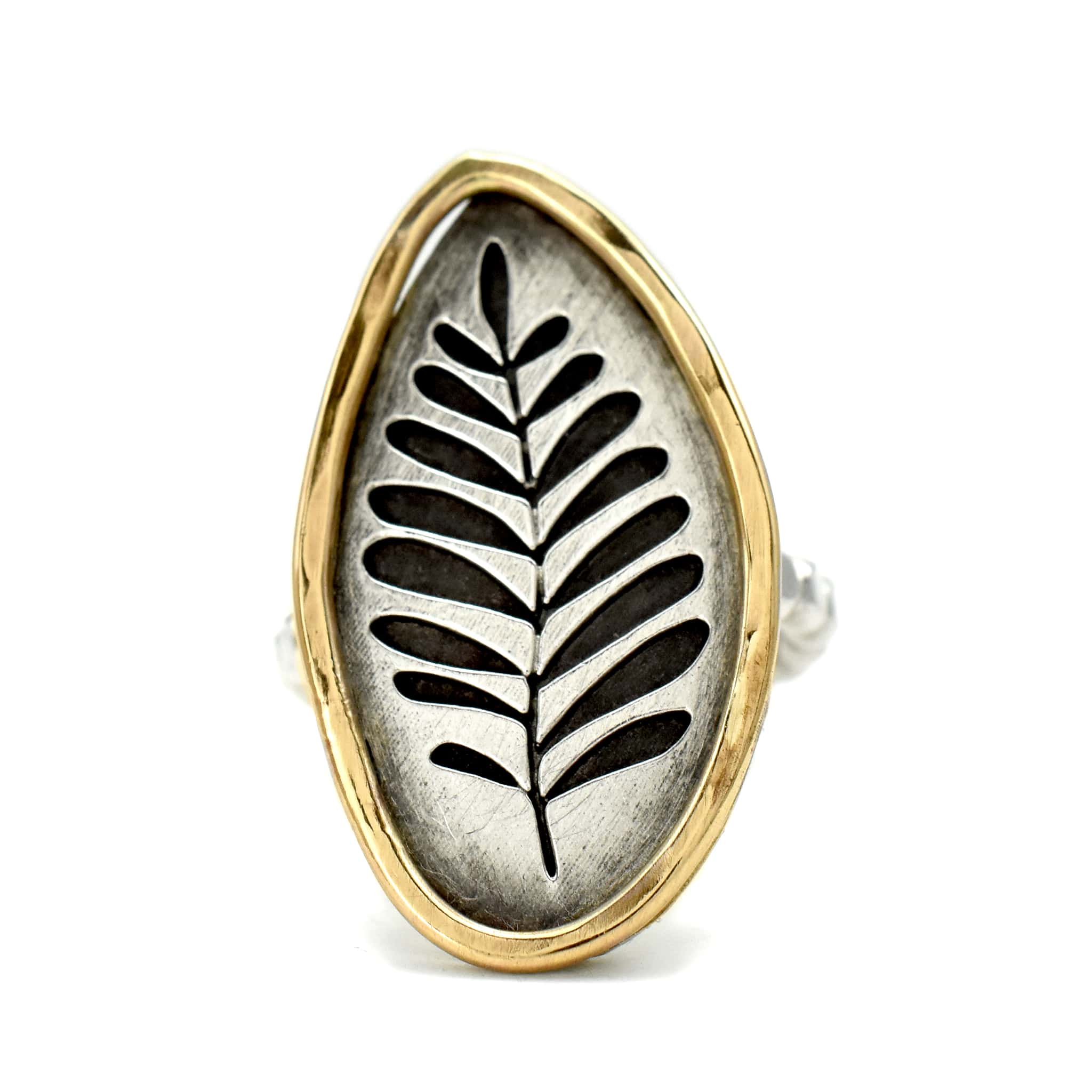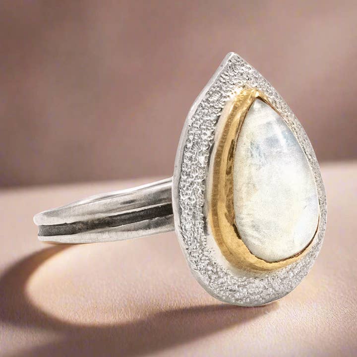 This exquisite labradorite marquis ring is a statement piece, set with a sterling silver bezel atop hammered 14kt gold filled bands. Its mesmerizing facets measure 20mm x 10mm, (3/4" x 3/8"), forming an eye-catching piece of jewelry.