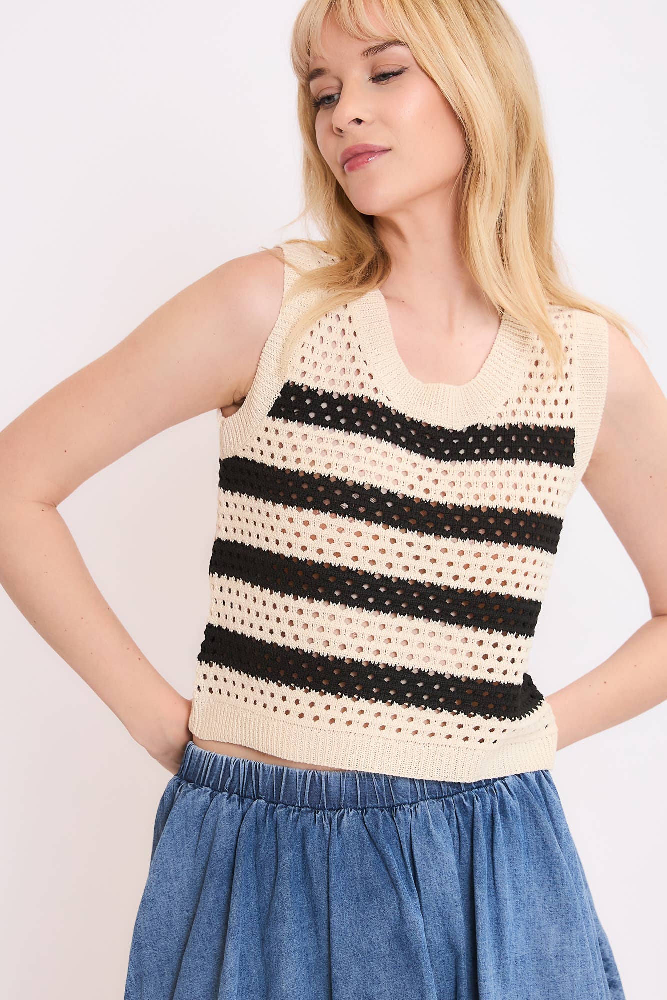 Knit Sweater Cotton Polyester See Through Weave Round Neck Sleeveless Tank Top With Back Deep U Neck Shape Details