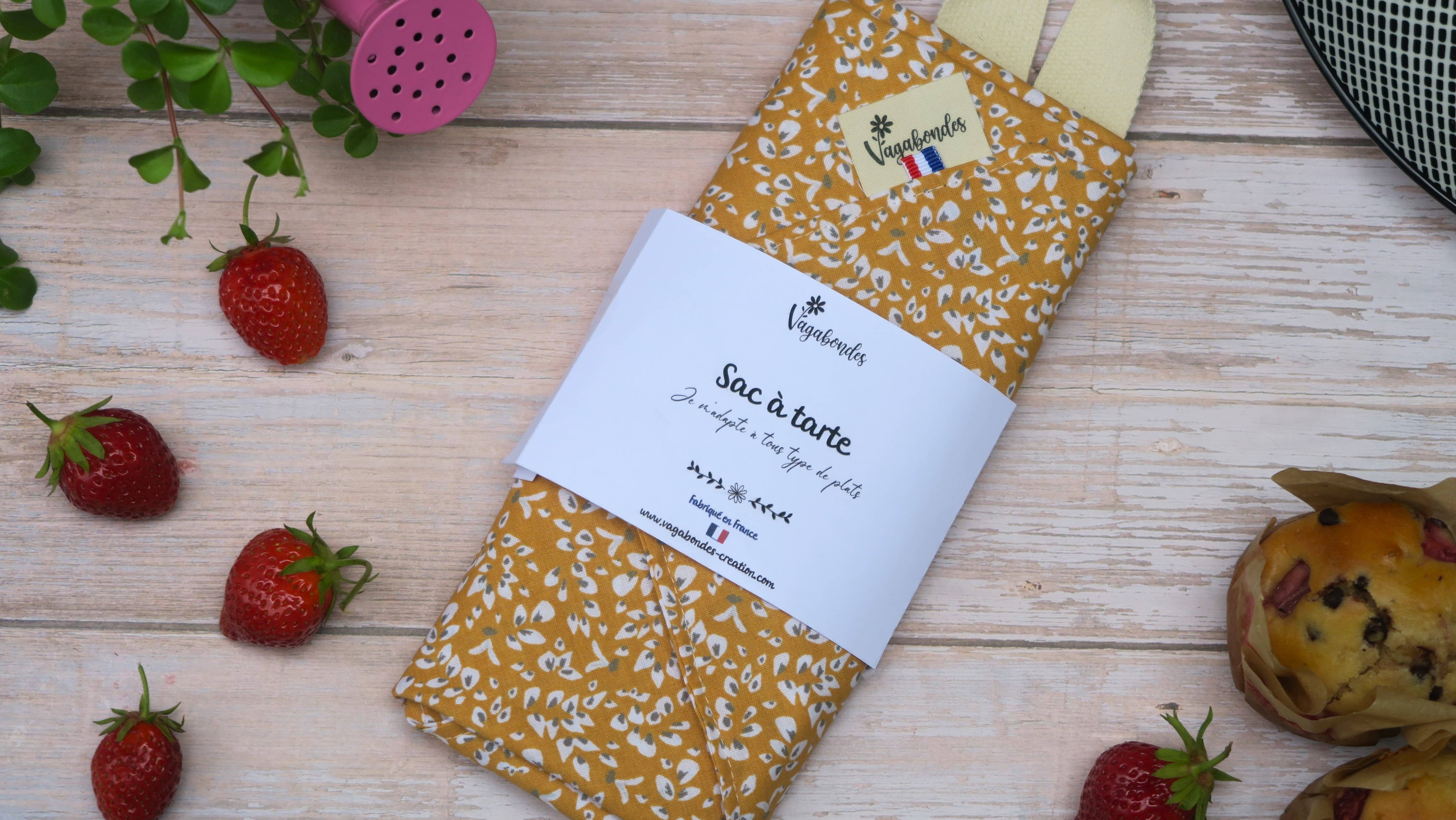 A little novelty at Vagabondes, the pie bag! It adapts to all types of dishes thanks to the handles! 100% handmade in France! Made, of course, with lots of love but also with colorful cotton fabric! Dimensions: Size: 52 x 52 cm Materials: Cotton fabric (certified 100% Oeko-tex Standard 100) and cotton strap! Non-contractual photos. Variations are possible depending on the fabric cut. Please note, items are produced in very small quantities.