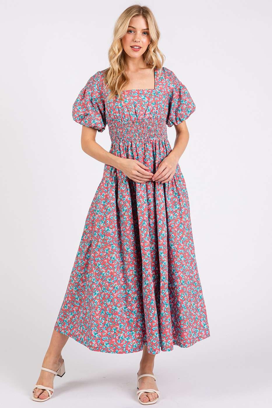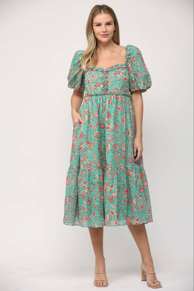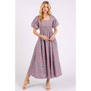 SKU: EE1411-DT BLUE-S, EE1411-DT BLUE-M, EE1411-DT BLUE-L Made in China Aesthetic: Casual and Romantic / whimsical Dress Style: Fit & Flare Embellishment: Pockets and Ruffles Fabric: 100% Poly Fit: Contemporary and Maternity Neckline: Square neck Occasion Theme: Baby Shower, Everyday, and Father's Day Occasion: Day Party and Everyday Pattern: Floral Season: Spring/Summer Skirt & Dress Length: Maxi Sleeve Length: Short Sleeve Weight: 453.59 g (1 lb)