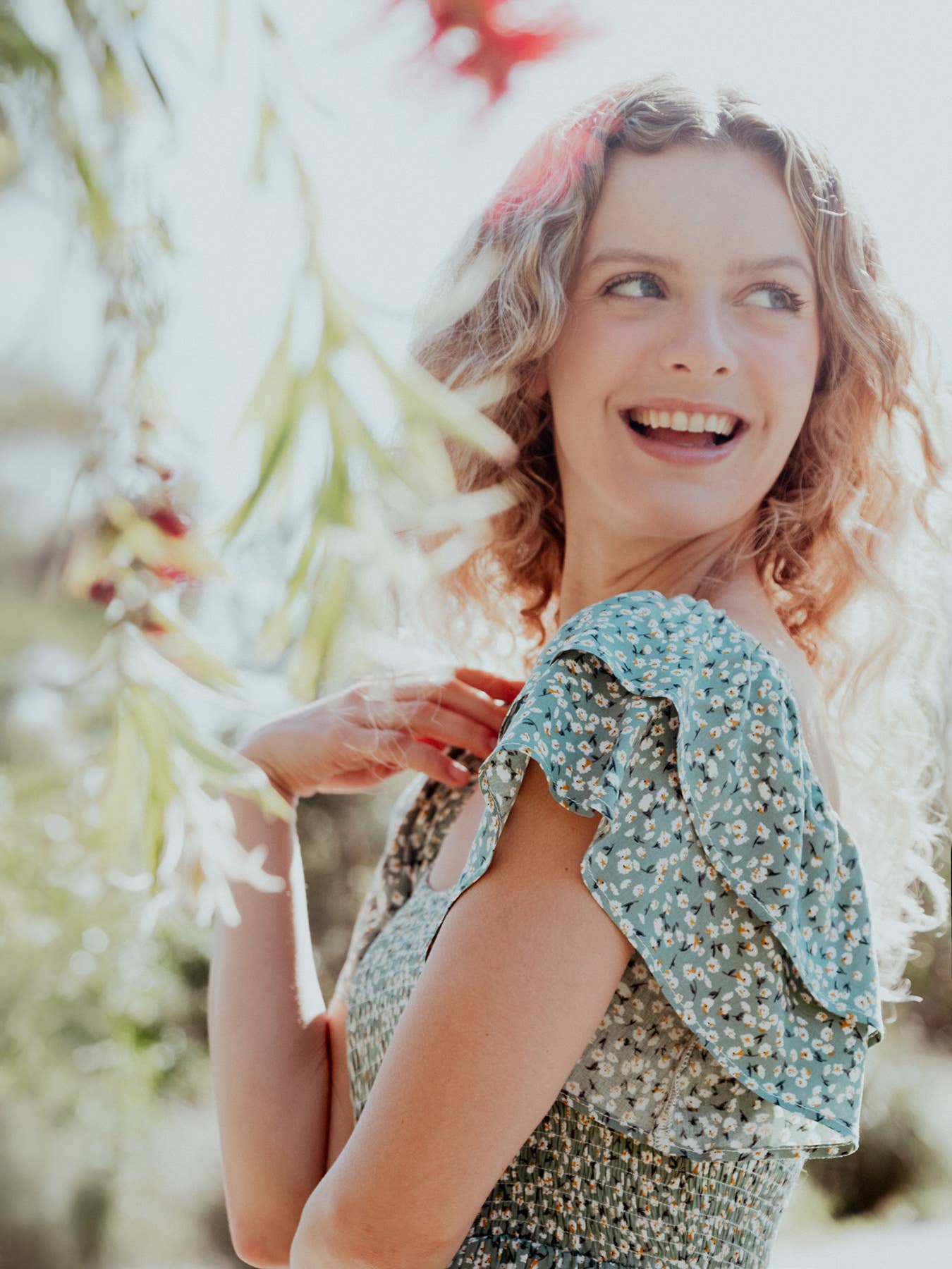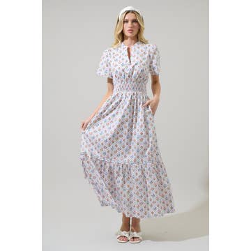 This womenās floral maxi dress brings a soft, romantic mood with its ruffled sleeves that can be worn on or off the shoulder. A smocked back offers a comfortable, flexible fit, while side pockets add everyday ease. The wide flare skirt moves beautifully in airy blue and gentle cream tones for an effortlessly charming look. Ruffled Sleeves On & Off Shoulder Back Smocked Side Pockets HPS Length: 54"
