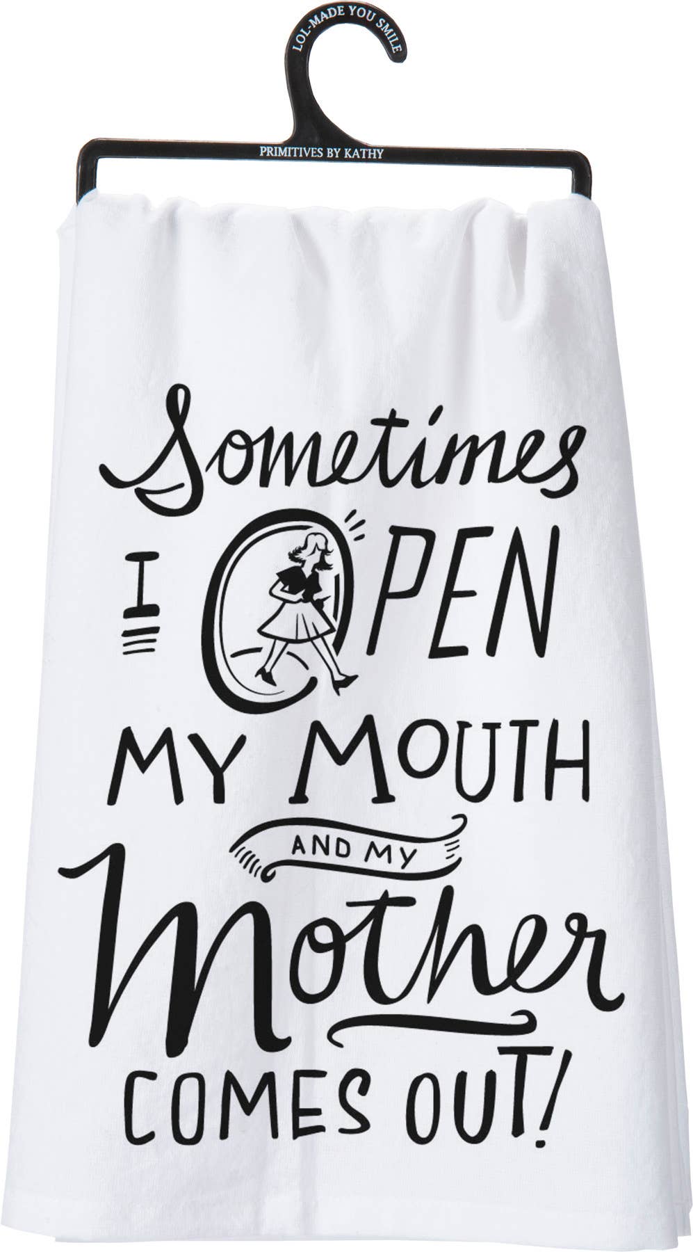 A black and white cotton kitchen towel featuring "Family A Little Bit Crazy A Little Bit Loud And A Whole Lot Of Love" sentiment. Machine-washable.