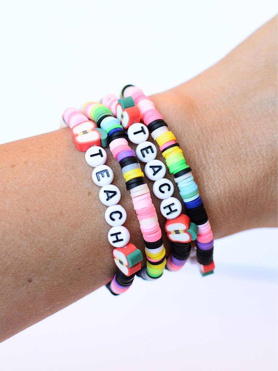 A colorful and meaningful teacher appreciation gift, thank-you bracelet set, and back-to-school jewelry designed to celebrate educators who inspire and encourage. This 3-piece stretch bracelet set is stylish, thoughtful, and ready to gift. Product Highlights: Set of 3 stretch bracelets Red poly disc heishi beaded bracelet with apple charms Gold accent bracelet for a touch of shimmer Letter beads spelling “TEACH” with heart charm Comfortable, lightweight stretch design for everyday wear Perfect for teacher gifts, thank-you presents, back-to-school surprises, or end-of-year appreciation Sold without card packaging (see other listings for gift ready card options)