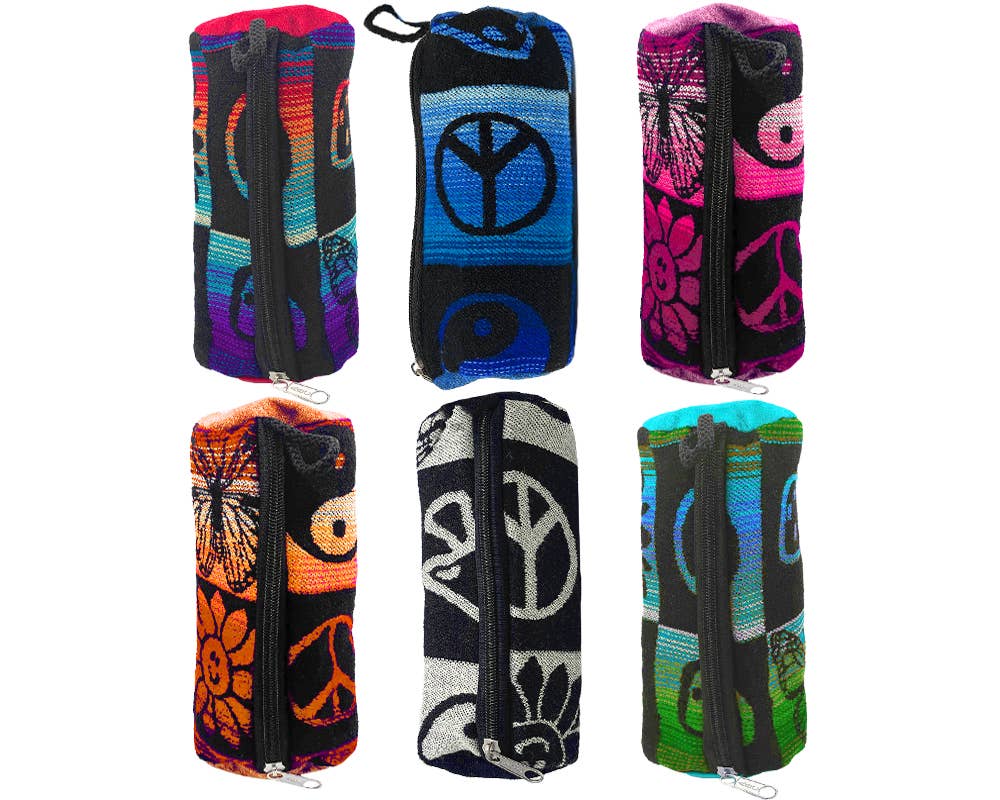 Small slim square shaped crossbody purse bag with multicolored Hippie themed print pattern material and 2 fringe dangles. Bag is slightly cushioned with lightweight padding. Worn with thick tribal print material crossbody strap for a comfortable fit. • Item code: EC-HEMP-HIP-2F-BG • Sold in assorted colors. • Approximately 7" x 6" x 1" • Sealed with zipper closure. • Handmade in Ecuador. Disclaimer: Each one of our products are handmade and unique. When ordering wholesale, customer will receive ASSORTED COLOR, AND/OR PATTERN variations of the product.