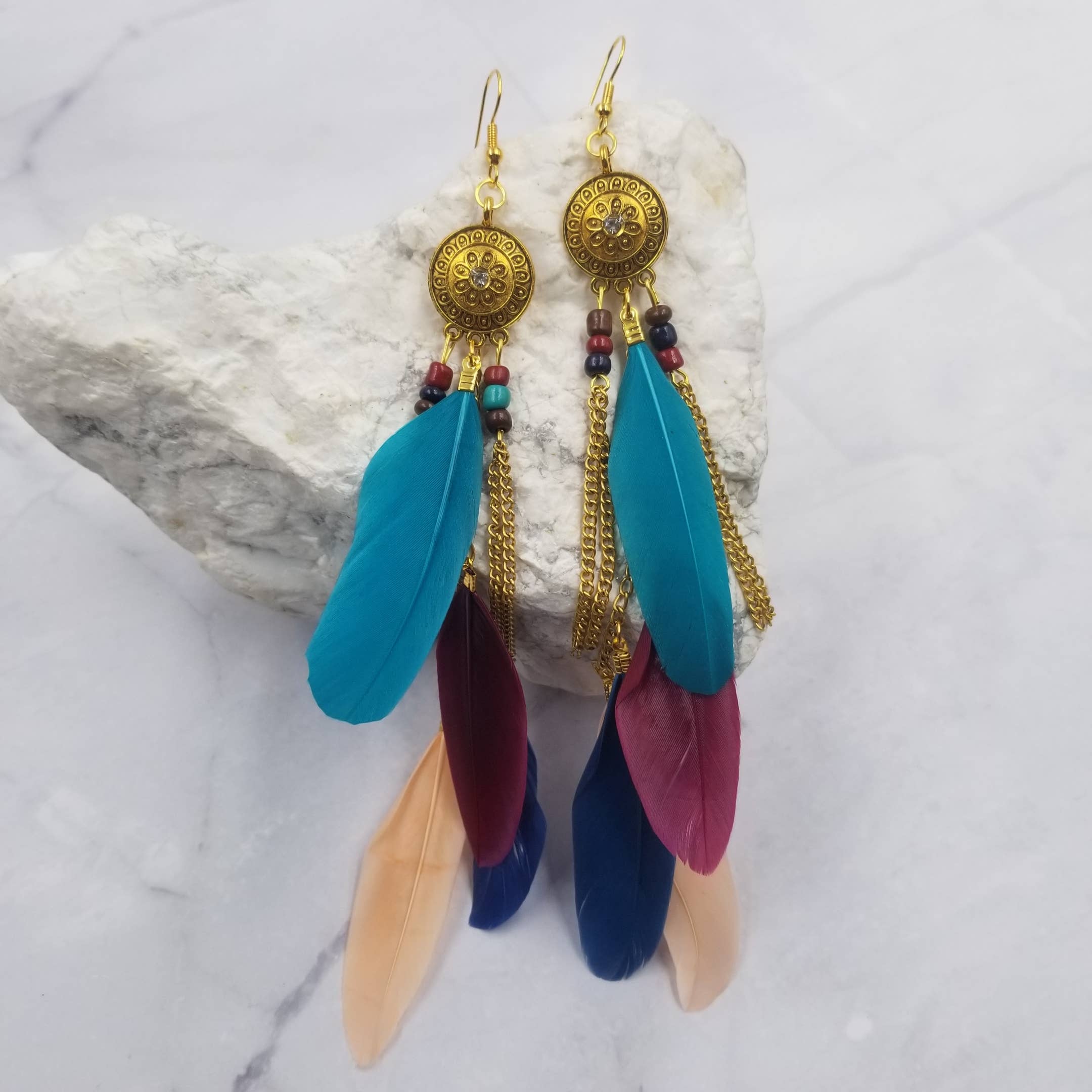 Feather earring with bold, colorful feathers. She adds a touch of elegance and fierceness to any outfit. Whether you're going for an elegant, boho chic, or casual look, Nahla will complement it perfectly. Pair her with a crisp white boyfriend shirt and Red bottoms for a sophisticated ensemble, or wear her with flats for a more relaxed vibe. Wearing Nahla is a fabulous way to express your personal style and showcase your confidence. Enjoy the bold and beautiful energy she brings to your look! Earrings approx. 3" in length.