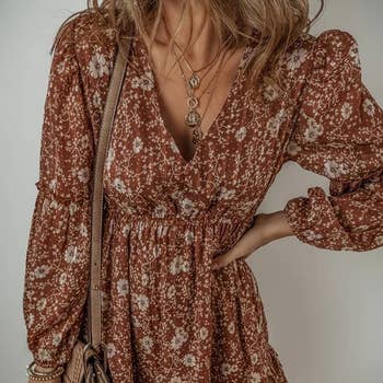 Floral Printed Flare Sleeves V Neck Dress