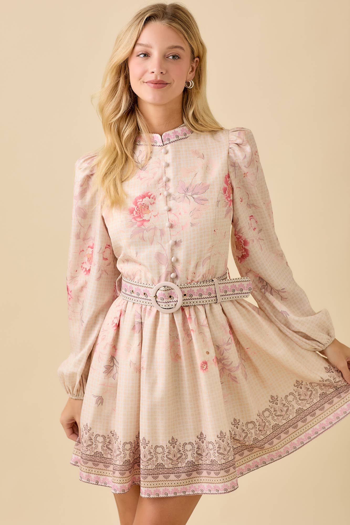 Soft dobby chiffon fabric with delicate texture Sheer dotted mesh neckline with lace trim for a romantic touch Puff sleeves with elastic cuffs for a vintage-inspired silhouette Flowy tiered mini skirt with a flattering A-line shape Dramatic open-back design framed with lace Fully lined except mesh detail Style: Dreamy, romantic, cottagecore-inspired Perfect for: Garden parties, bridal showers, afternoon dates, or spring picnics Self: 100% Polyester Contrast: 90% Nylon 10% Spandex Lining: 100% Polyester Size S (2) - M (2) - L (2) Made in China Model is wearing small, 5' 10" 33 - 25 - 34
