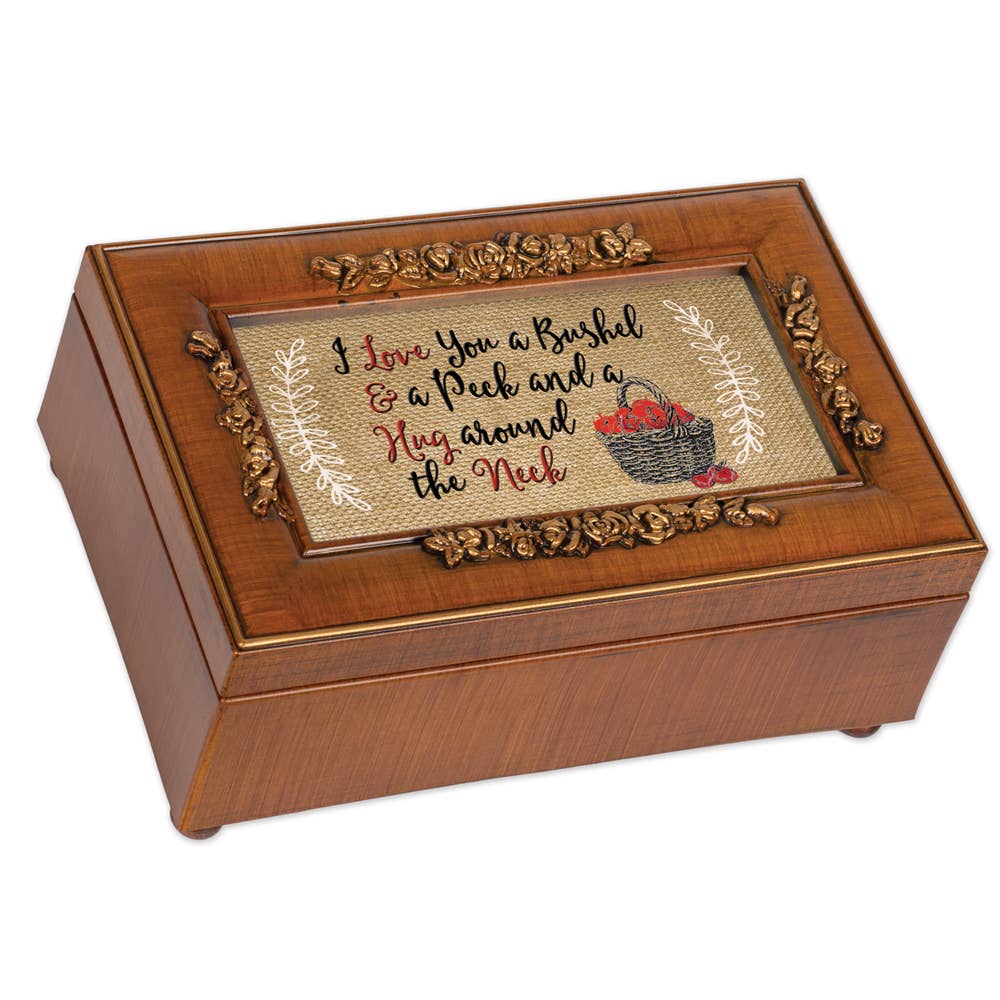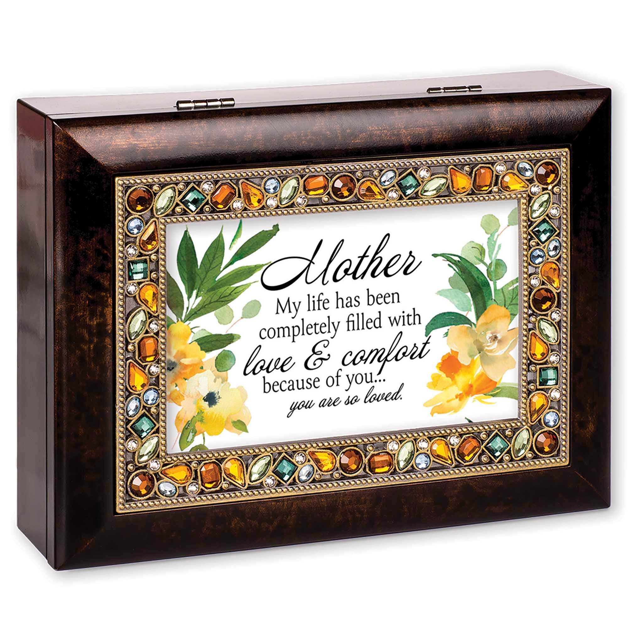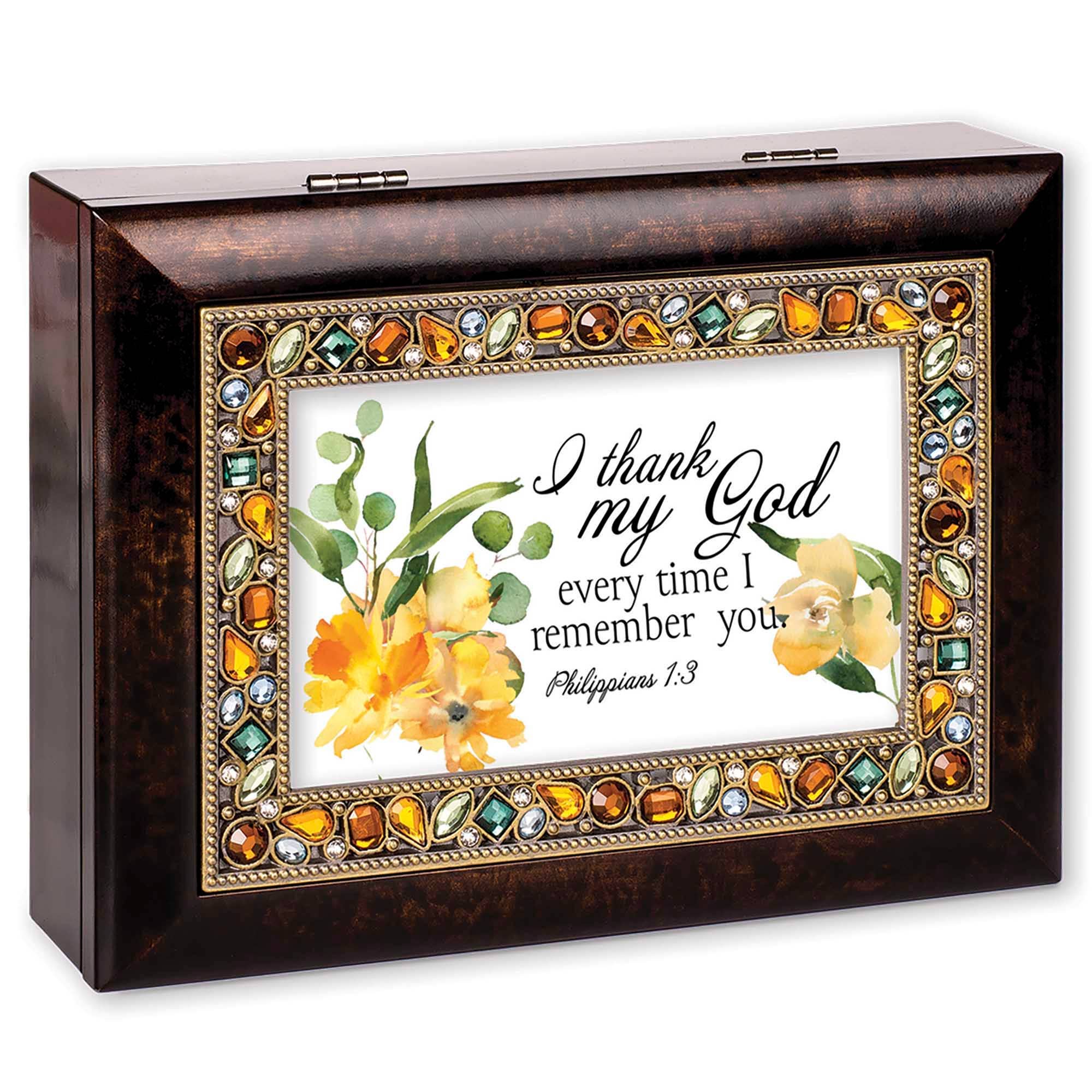 Amber Earth Tone Jeweled Music Box in Burlwood style finish. Beaded jewels frame the hinged lid. Jewelry box measures approximately 6 x 4 x 2 inches; Window opening hold 4 x 2 inch personal photo. Black velvet lined interior; Decorative bun feet are padded to protect table top and shelf surfaces. Individually boxed. Wind-up music box plays Wonderful World.