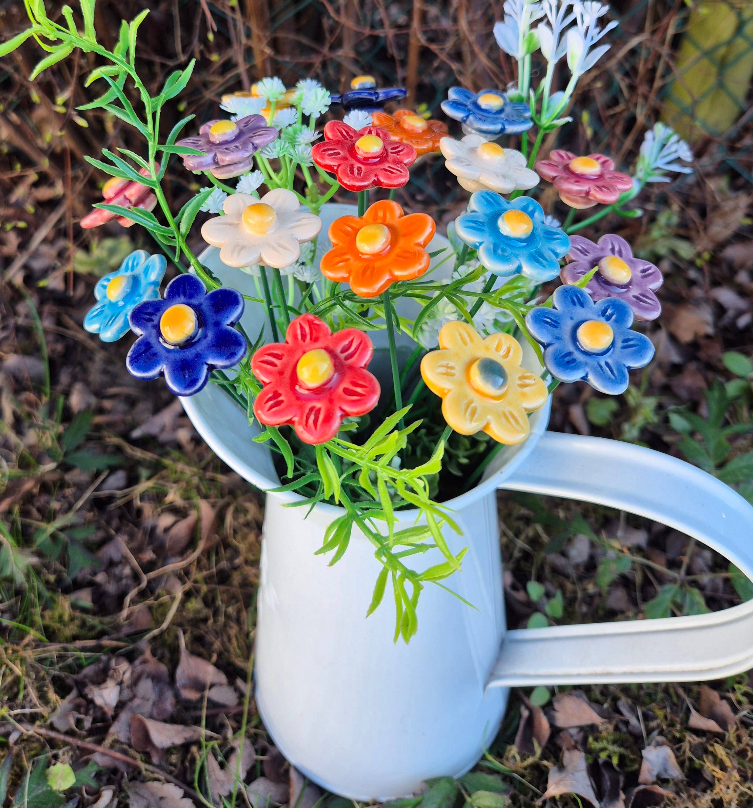 Decorative, unique strawberry Blossom - Ceramic Flowers for home, garden, creative decorations and gift for anniversary, birthday. Incl. with the stem. -Each flower is glued to a green wire coated stem. The wire stems can be bent or cut shorten. -Each flower handmade, so there may be differences in form, color and size. -They can be displayed alone in a vase or add some greenery or decorate your indoor plants. Stake them into your lawn, flower bed, plant pots. -They are also suitable for garden decoration but during very cold frosty condition I recommend to place them indoor as they might get deteriorated if the temperature gets below zero. Size: Diameter of the head is 30-35 mm 1.18 - 1.37 Inch Wire shank: 19 cm - 7.48 Inch