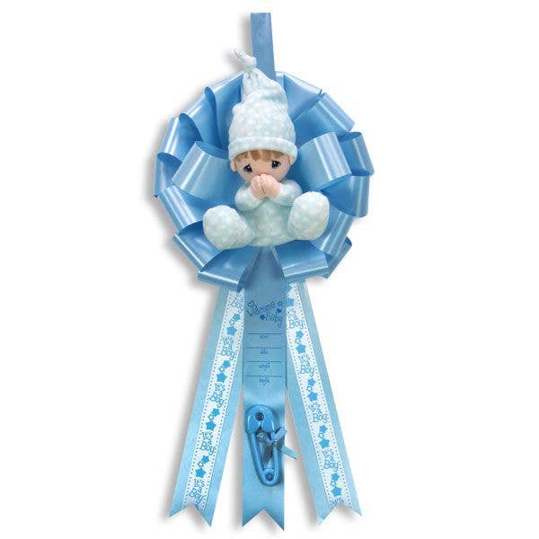 Baby Birth Announcement Ribbon with Plush Musical Bear on Moon - It's a Boy Few things are as exciting as the arrival of a newborn baby! And, Kelli's exclusive baby announcement ribbons are the perfect way to announce the joyous event! This announcement ribbon features a blue pull-string musical bear on moon plush, a large blue bow with blue and white ribbon streamers, and a ribbon for personalizing with baby's birth information. Whether hanging on a hospital room wall or door, or displaying at home in baby's nursery, this keepsake ribbon will be treasured by proud parents! Ribbon measures approximately 24 inches long Pull-string musical plush measures 14 inches long Bear on moon plush toy plays Twinkle Twinkle Little Star sold individually Printed ribbon streamers read "It's a Boy" Ribbon for personalizing with baby's name, date, weight, and length reads "Welcome Baby" Kelli's exclusive!