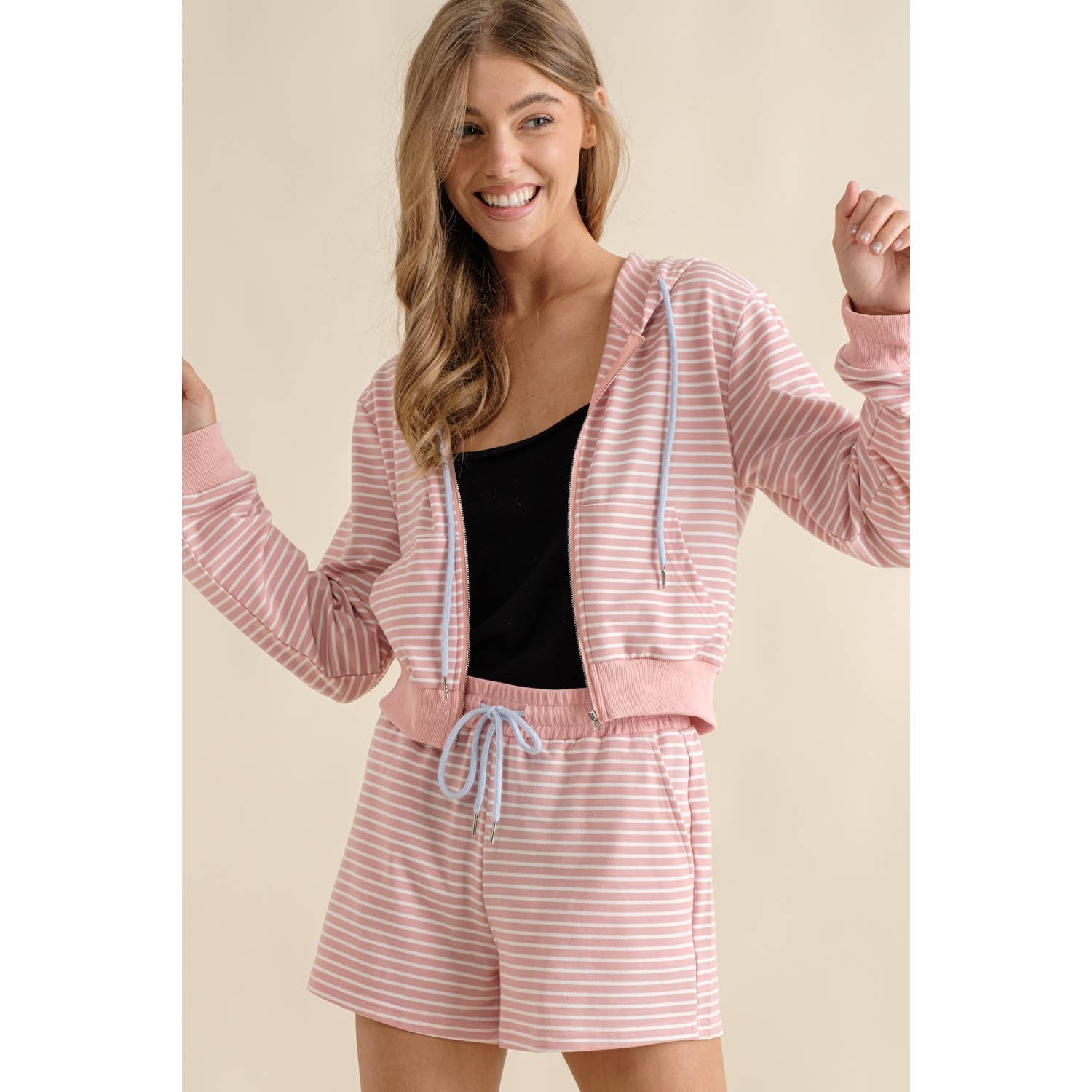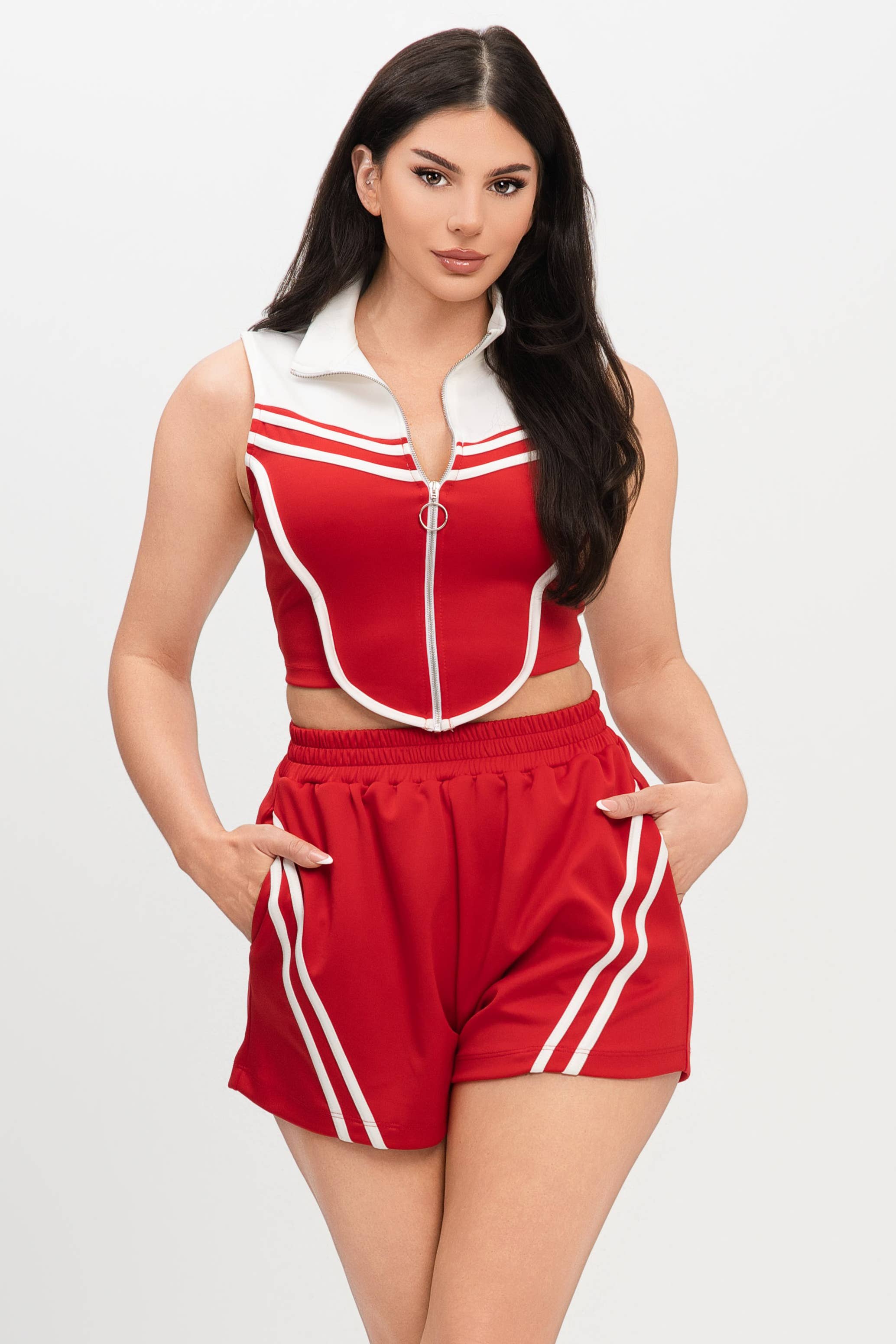 Stripe Color Block Contrast Trim Details Front Functional Button Down Detail Collar Neck Short Sleeve Crop Top And Elastic Waistband Drawstring Tie Side Pockets Shorts Set Model: 5' 7, Bust 33", Waist 25", Hips 40" 78% Rayon, 19% Nylon, 3% Spandex