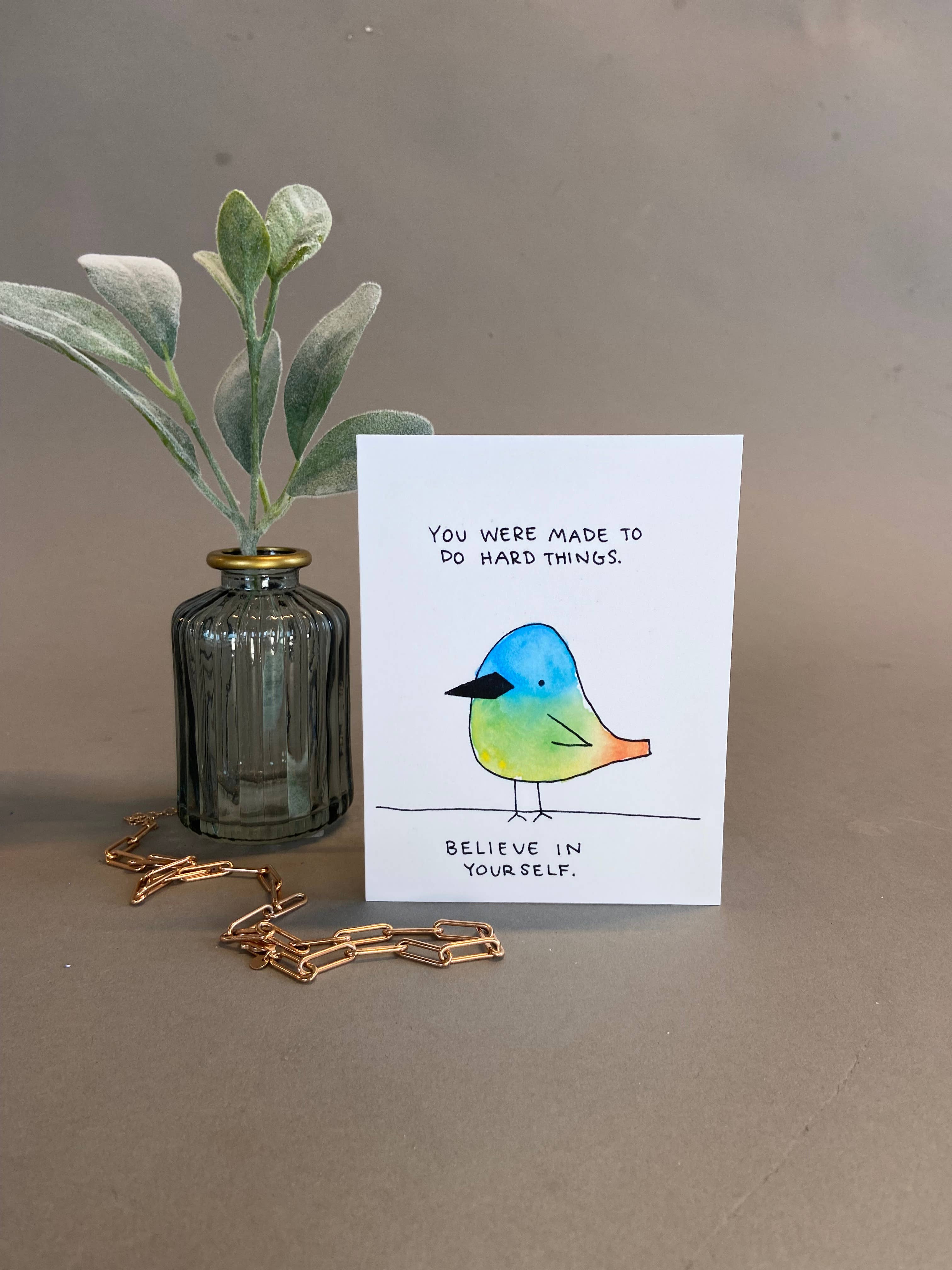 This card is an original design that gives a nice homemade touch to anyone receiving it. The inside is blank with the brand name on the back. The card comes with a brown kraft envelope inside a plastic sleeve that gives it a slick look for display in any store. 3% of all sales are donated to a non profit providing resources to help combat Mental Health