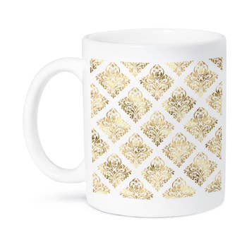 Serve and enjoy your favorite beverages and appetizers in style with Certified International’s elegant “Mosaic” metallic gold plated Mug Sets and matching separate Canape Sets . Each 6 piece set features 6 assorted gold designs on white porcelain 14 oz Mugs or matching 6” D Plates, which coordinate beautifully with any tablesetting . Get both sets to complete your entertaining style. Mix and match with the beautiful Matrix gold plated Mug or Canape Sets, featuring different assorted gold designs.