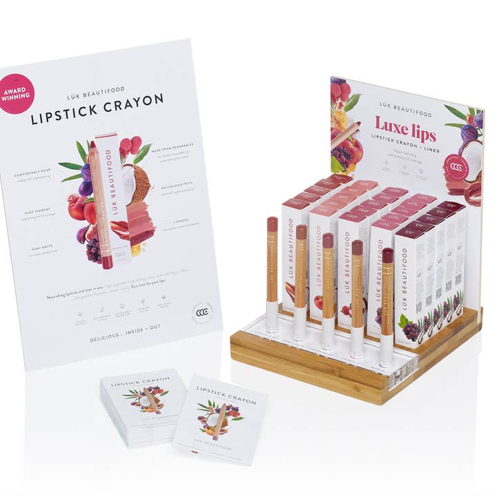 ![Eco-luxe Lipstick Crayon Starter Bundle (25) incFree Display for wholesale by LÜK BEAUTIFOOD [🇦🇺 AUS + USA🇺🇸]](https://cdn.faire.com/fastly/b2b19b803c7125f4f55a8a97b1206a80659804a11fee74645e26159eeb9418e0.png?format=jpg&precrop=1%3A1&width=720)