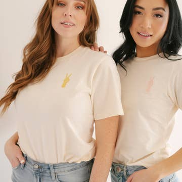We're bringing back our peace hand tee in a new way - with an embroidered design. Find this style in three colors. NOTE: - Slightly oversized fit - NOT preshrunk so they do have about 3% shrinkage if dried - Sewn-in labels on the neckline, hang tags are attached - individually wrapped in recycled plastic poly-bags. We ask that you pay it forward by reusing them or recycling them at your local grocery store - Screen printed using eco-friendly water-based inks Each tee is made in Bangladesh by makers whose mission is to protect the environment and consciously strive to minimize the use of natural resources in the manufacturing industry. The factory is focused on the well-being of its staff, from paying fair salaries (on time!) to providing employees with on-site childcare and access to medical care, including free medications when needed.