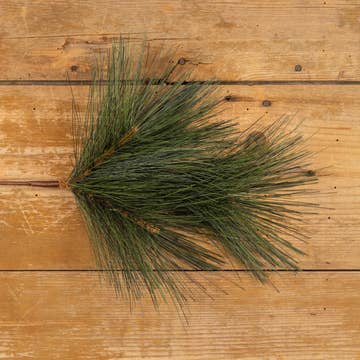 The Stone Pine Spray is a decorative spray with a sturdy, silky, brown-wrapped stem. The spray features branches of pine greenery with long, sturdy needles. This spray offers a simple and natural addition to the home, perfect for the Winter and Christmas season. Display this spray nestled inside of a vase or pitcher, placed on a shelf or table. Measures 21” long.