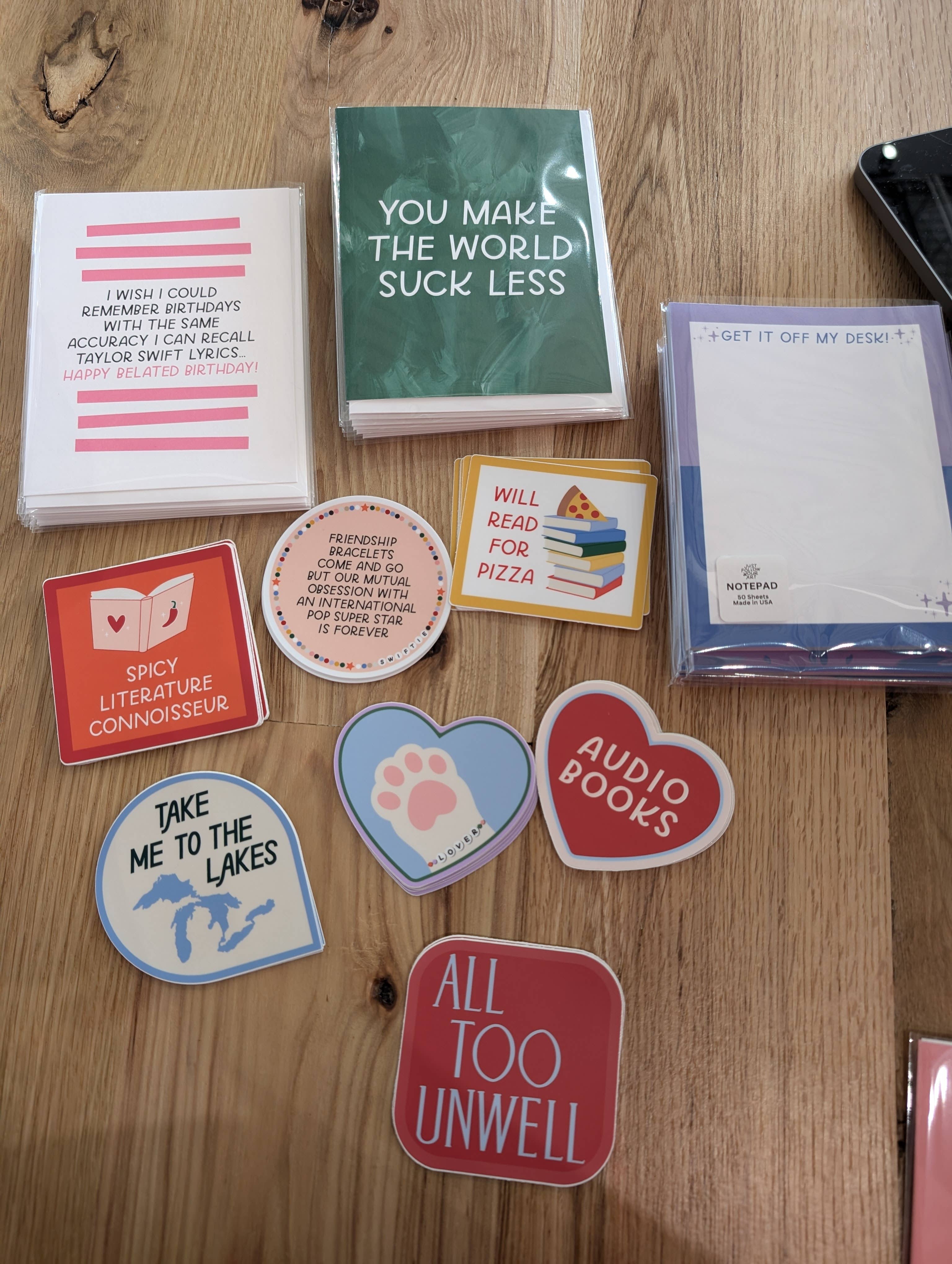 I love stocking Just Follow Your Art! Adorable designs, cats, bookish, Taylor... everything we love! and it always comes quickly and perfectly packaged!