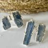 Blue kyanite helps you speak your truth... * two silver electroplated rough cut blue kyanite settings * silver plated split cuff ring To prolong the life of your jewelry, avoid contact with perfume, lotions, and water. Store in a bag or jewelry box.