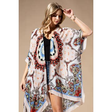 Our best-selling Sofia, in a Zing print featuring energetic pops of color! Figure flattering, asymmetrical hemline is longer on the sides than front and back. Wear as is for a flowy presentation or tie one or both sides for a different look! Tuck the front if you want, for a hi-low styling. The buttery soft viscose lining has you covered. Made in Italy. • Sheer sleeve to the elbow • Easy Kaftan fit • Unique splatter print • One size fits most (REALLY!) *2 – 12/14 • Machine wash cold, delicate, with like colors. Lingerie bag recommended. Disclaimer: Please note that each item is individually crafted and due to the nature of repeating patterns and cutting process, placement of colors may vary from the photo depicted.