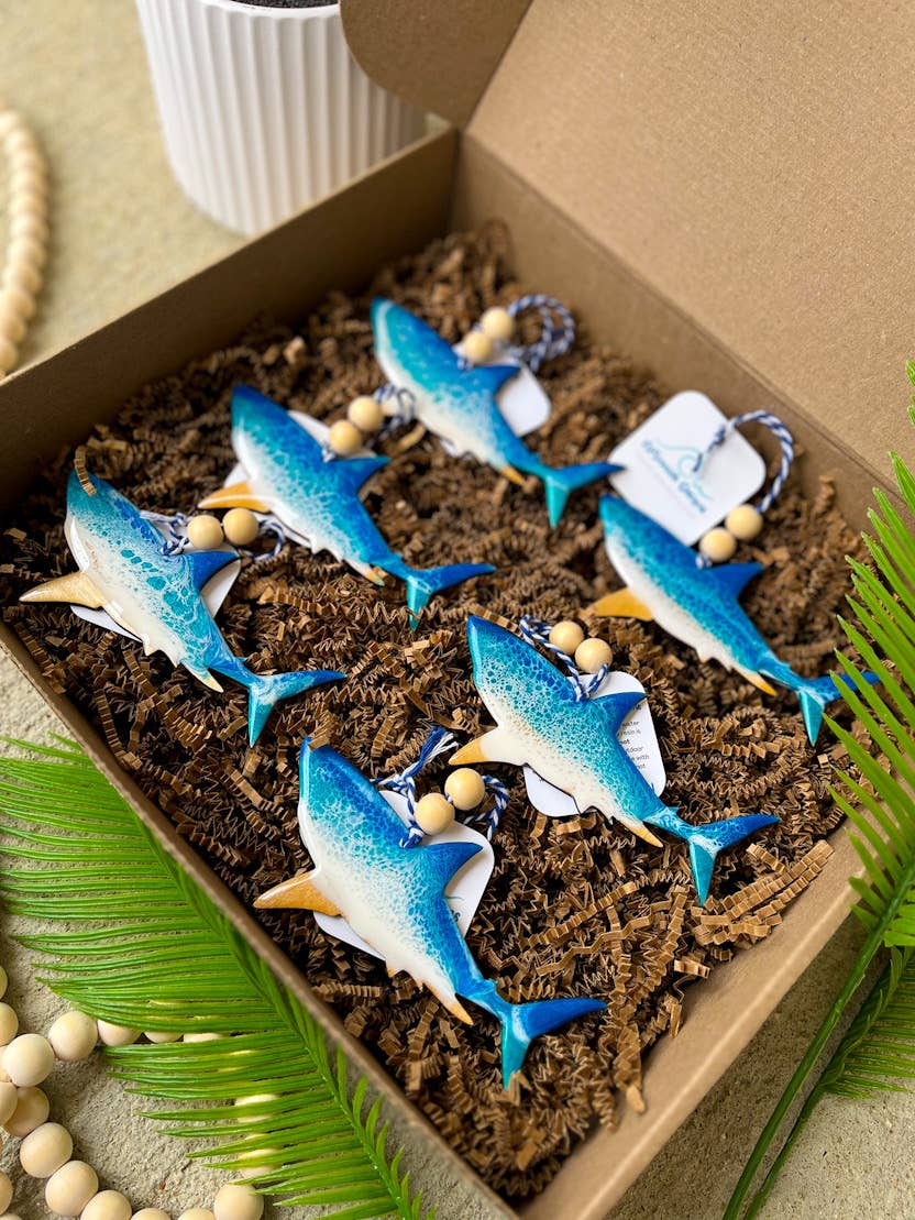 Whale shark–shaped ocean resin ornament featuring flowing blue waves inspired by tropical waters. This gentle giant design highlights the whale shark’s distinctive silhouette, making it a fun coastal accent for ocean animal decor, nautical gift collections, aquarium shops, and marine life–inspired retail displays. Every piece is laser-cut from quality birch wood and handcrafted in small batches. Layers of VOC-free epoxy resin are mixed with premium mica pigments to create mesmerizing ocean wave patterns — no two ornaments are ever alike, just like the tides themselves. Finished with baker’s twine and natural wooden beads, these lightweight ornaments make a stunning addition to Christmas trees, gift packaging, or year-round coastal displays. . Product Highlights: • Handmade in small batches • Lightweight — approximately 1 oz • Size: 5-5.75 inches • Laser cut from 1/8" birch wood • Handcrafted with VOC-free epoxy resin and mica pigments • Each piece has a one-of-a-kind wave pattern • Finished with baker’s twine and two wooden beads • Back is sealed wood with clear gloss finish (no resin on back) • Eco-friendly packaging — plastic-free and recyclable Care Instructions: Avoid excessive heat and water to maintain the finish and resin clarity.