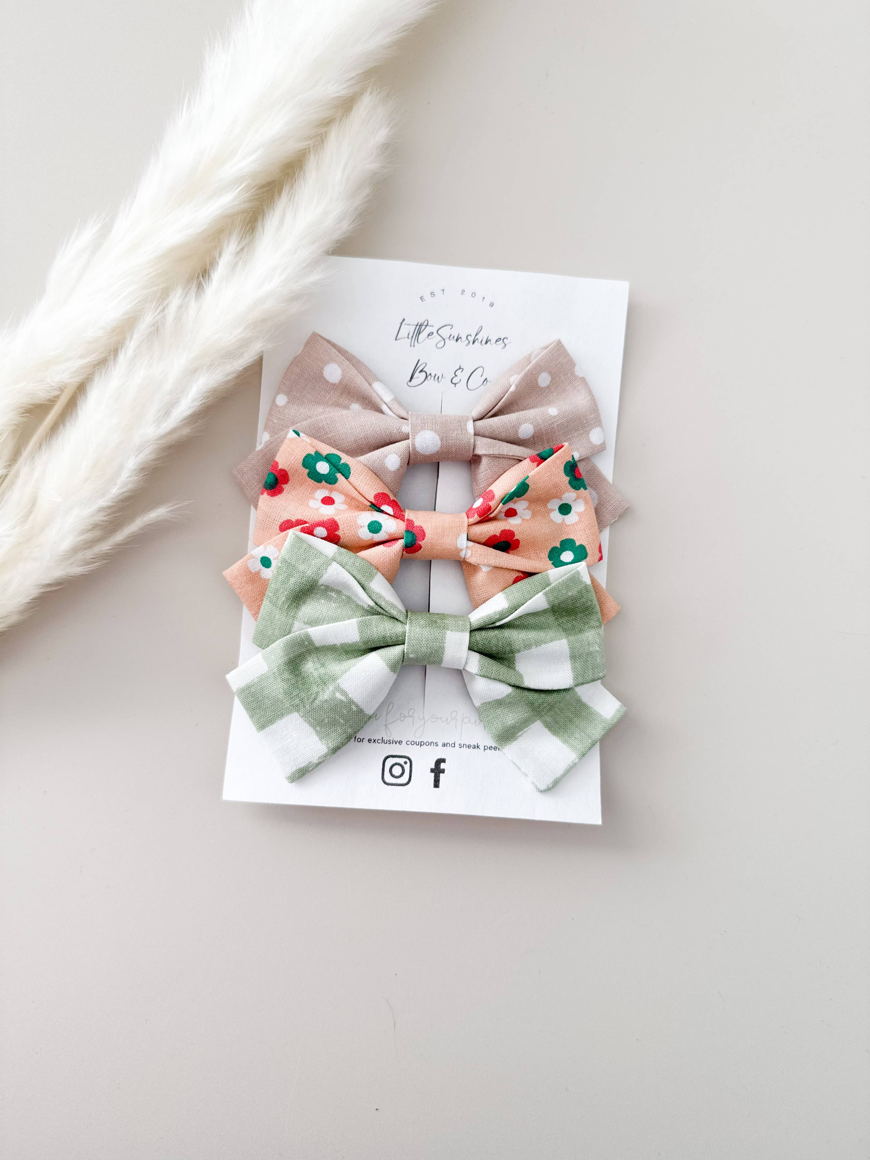 + Color: Taupe Linen & Taupe Mini Check + Pack of 2 bows with alligator clips + Also available in nylon headbands - see other listing + These bows are handmade so they may vary slightly in size. + Size: Approx 2" x 3" + Color may appear slightly different than the photo due to lighting. + Every bow is unique and print placement will not be exactly as shown in photo. + Each Bow & Clip set comes packaged ready to sell in a clear protective, resealable sleeve.