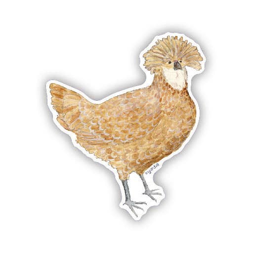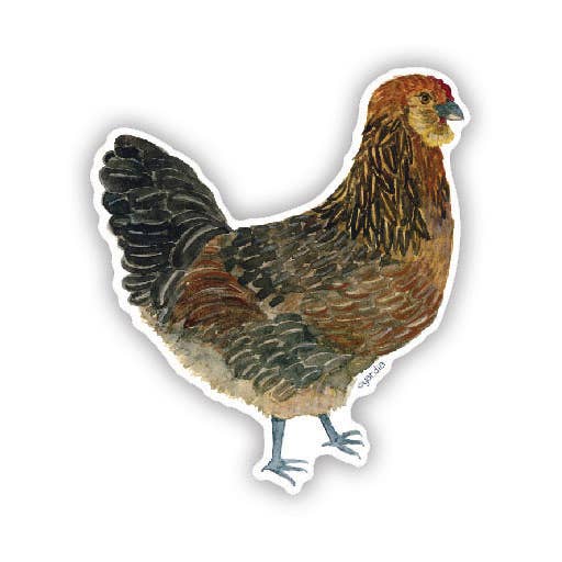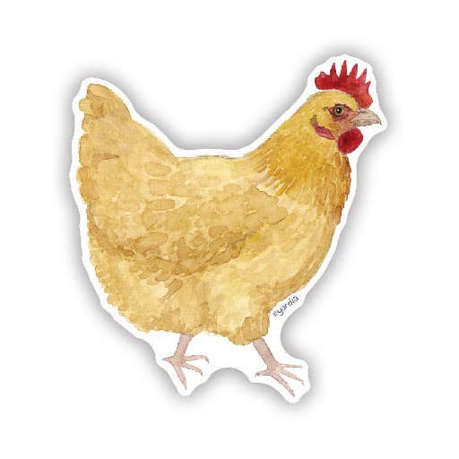 Delight your chicken loving customers with this watercolor chicken sticker. This vinyl sticker features a watercolor illustration of the artist's backyard pet chicken Esther, a Barred Rock hen. Perfect for your customers' laptops or water bottles. Illustrated in watercolor by multiracial Seattle artist Brigida Swanson. Many more chicken-themed stickers, cards and art prints also available from Yardia! Size: approximately 3" x 2.8". Weatherproof, fade resistant and water resistant. Permanent adhesive. Dishwasher safe. Sold loose. Made in the USA.