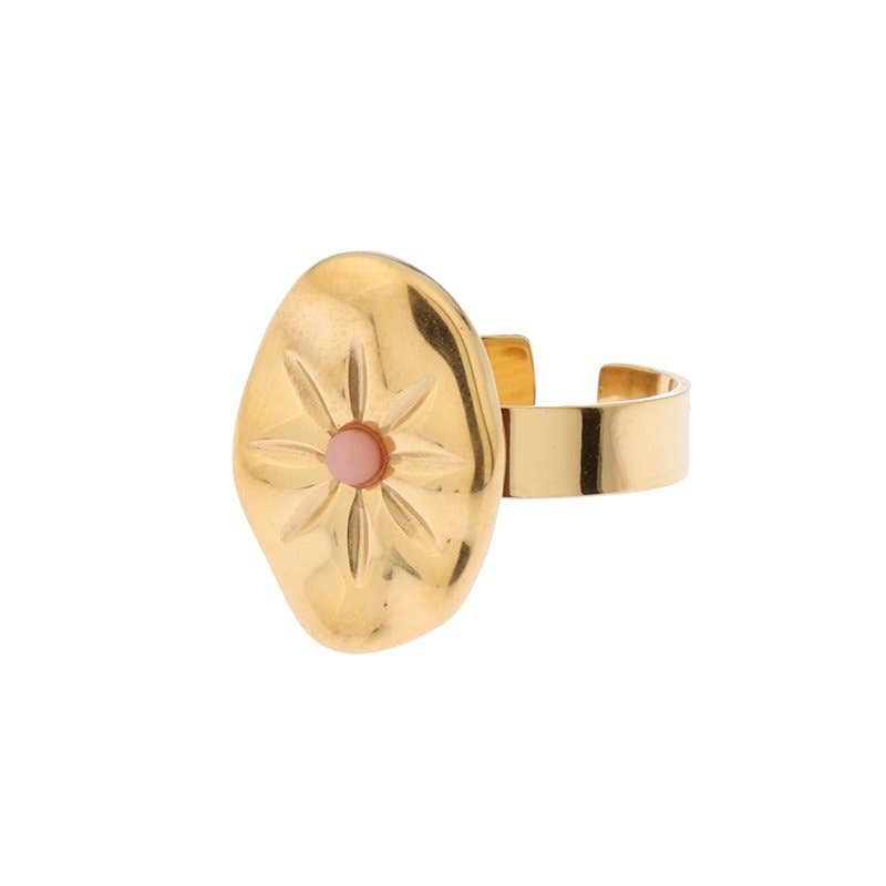 Beautiful stainless steel ring with a 14k plating layer. The ring also contains a natural stone. The minerals used are agate, aventurine, amethyst, rose quartz, rhodochrosite, goldstone, sodalite, malachite, and feldspar. The back of the ring is open, allowing it to be adjustable in size.