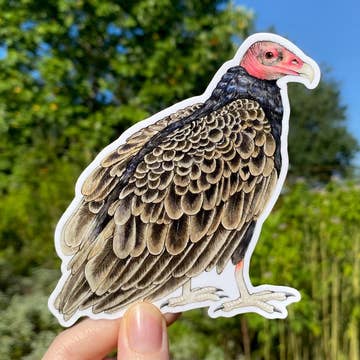 This sticker featuring my watercolor painting of a Turkey Vulture is made of a durable vinyl, laminated to protect against scratches, rain, and sun. It measures 3.5" inches and has a matte finish. It can be used on water bottles, laptops, cars, planners, etc.  This item is loose with no packaging.