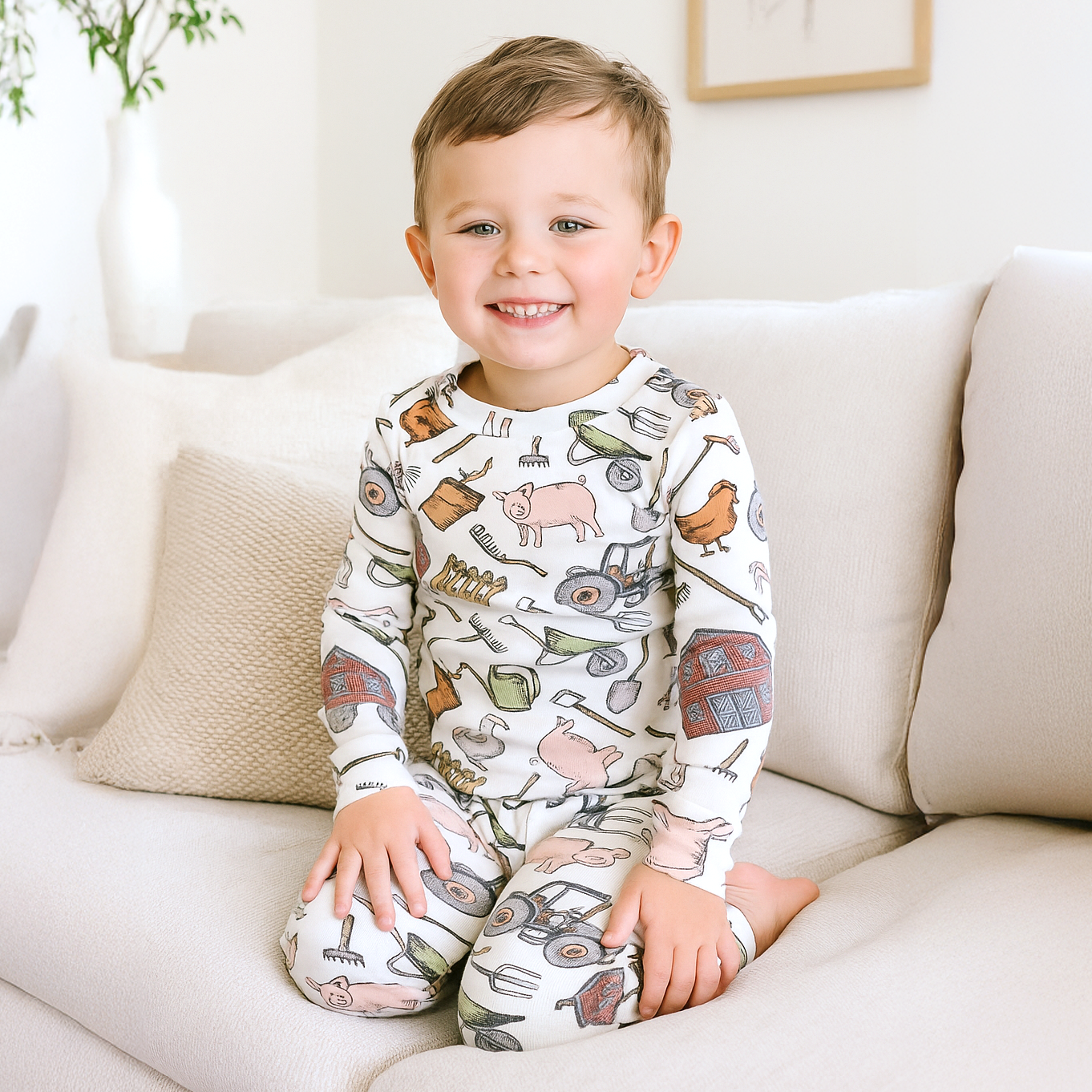 Ultra soft kid's pajama set made of bamboo/cotton/spandex blend jersey. Bamboo is absorbent, hypoallergenic, eco-friendly, and sweat resistant. The top has a crew neck and bottoms have an elastic waist. Machine Wash Warm. Tumble Dry Low.