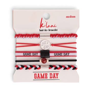This Game Day set is made to show your school spirit with style and pride. These 5 hair tie bracelets feature bold team colors of red and white and are perfect for cheering from the sidelines or celebrating a win. With a “Let’s Go” charm and a natural stone bead accent, this set is a fun way to support your team and wear your pride on your wrist while ready to pull your hair up when the games gets intense. Medium is the size of a normal hair tie band. It fits wrists between 5-6.4" around. Large is sized for wrists 6.5-7.5"