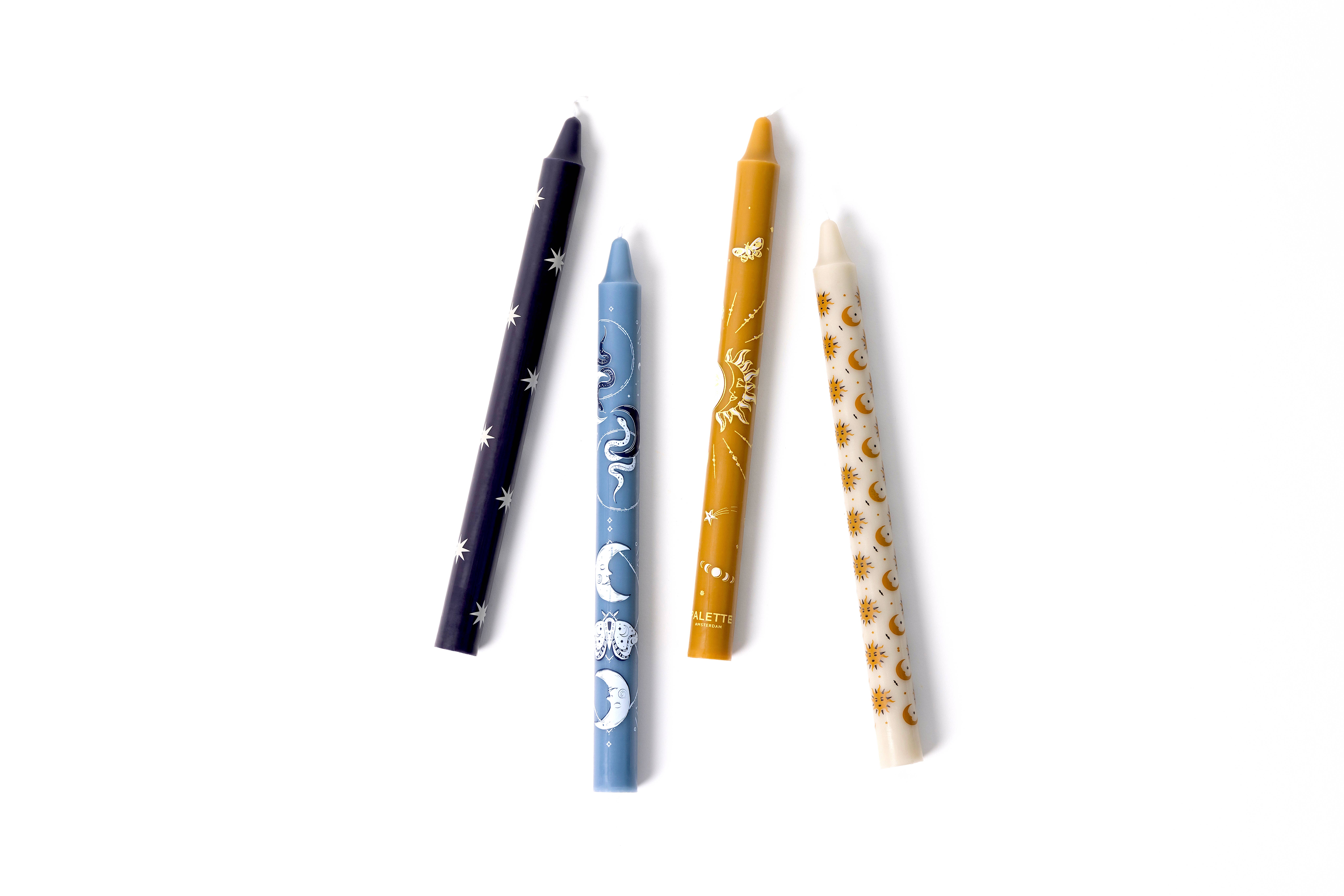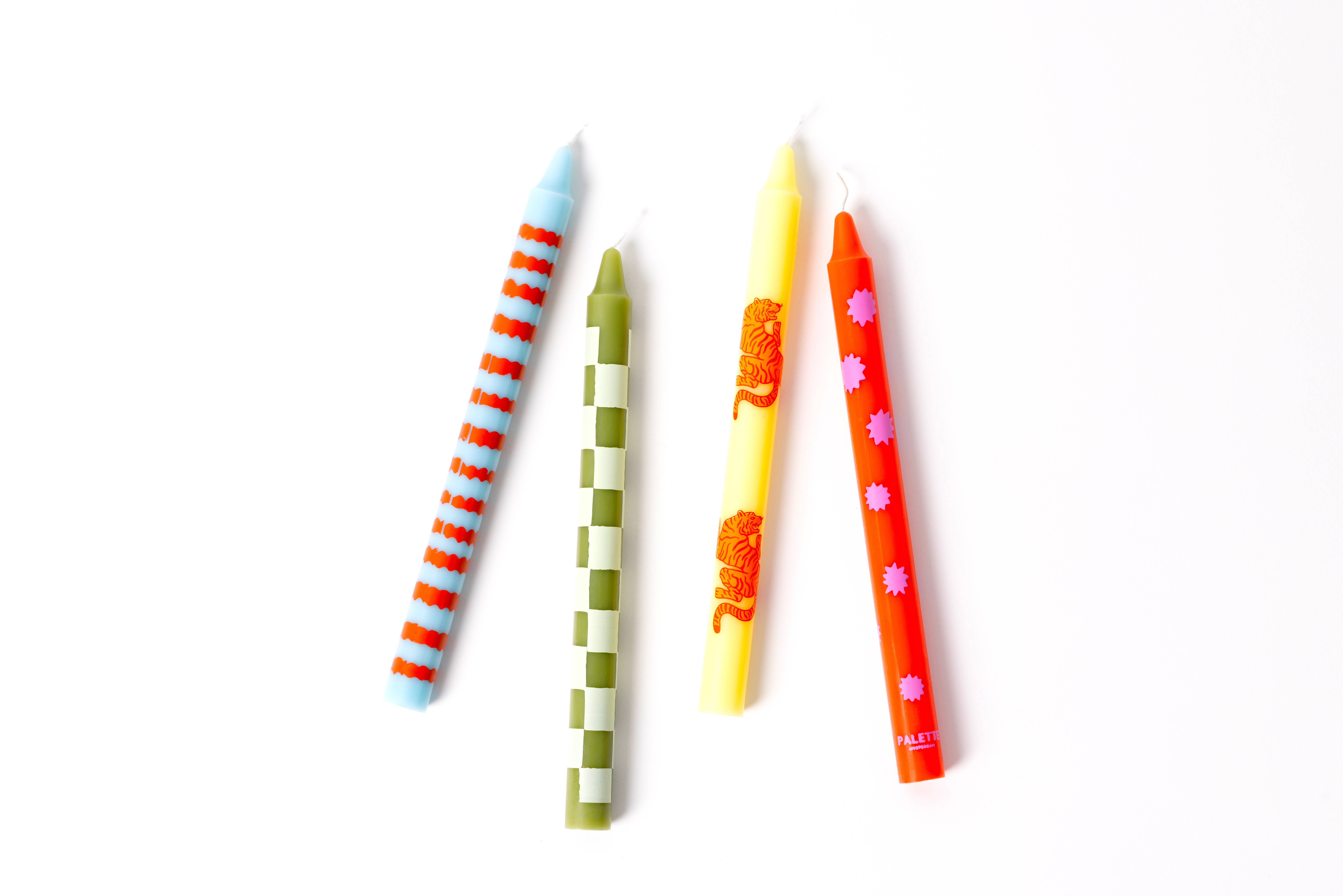 We are proud to introduce our unique, printed candle designs! The Perfect Match Palette is a set of four, long, dinner candles with custom-designed prints in a palette of pink, red, and white candles. This set was created with a love letter in mind, for yourself, your home, or others. Each candle has a different print design of wax. Together, they instantly look beautiful in-store and at home. QUALITY - The candles are low-soot and low-emission. They burn neatly for 9-10 hours, are 25 cm tall, and fit in almost every chandelier. UNIQUE DESIGN - Designed by Maxine in Amsterdam in our signature set style and produced exclusively by Palette. HIGH IN DEMAND - Unparalleled candle designs with high turnover. I am fortunate to sell many on a daily basis. Will your shop be next? SOCIAL - Buy Light, Give Light. Read more on paletteamsterdam.com Price & package = Set of 4 matching candles in a natural carton, gift-worthy packaging, like the image. Have a look at our other designs too!