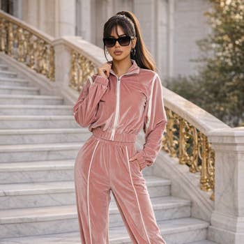 An all-time favorite in the softest velour with famous fitted style. Tracksuit Set includes a zip up hoodie and sweatpant, 2 front half-kangaroo pockets, ribbed cuff and a full zip closure. Rhinestone embellishments are found on both pieces, forming dazzling patterns and designs you won't be able to miss!