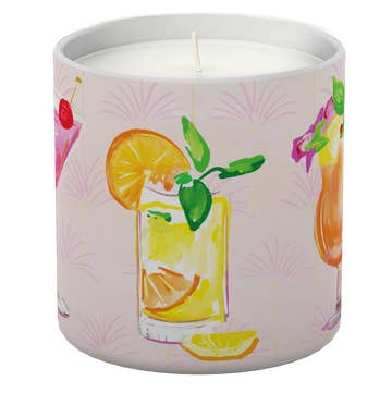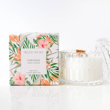 Showcasing a modern architectural paradise this candle features sleek villas surrounded by lush greenery, palm trees, and a backdrop of majestic mountains, evoking a serene and luxurious ambiance.