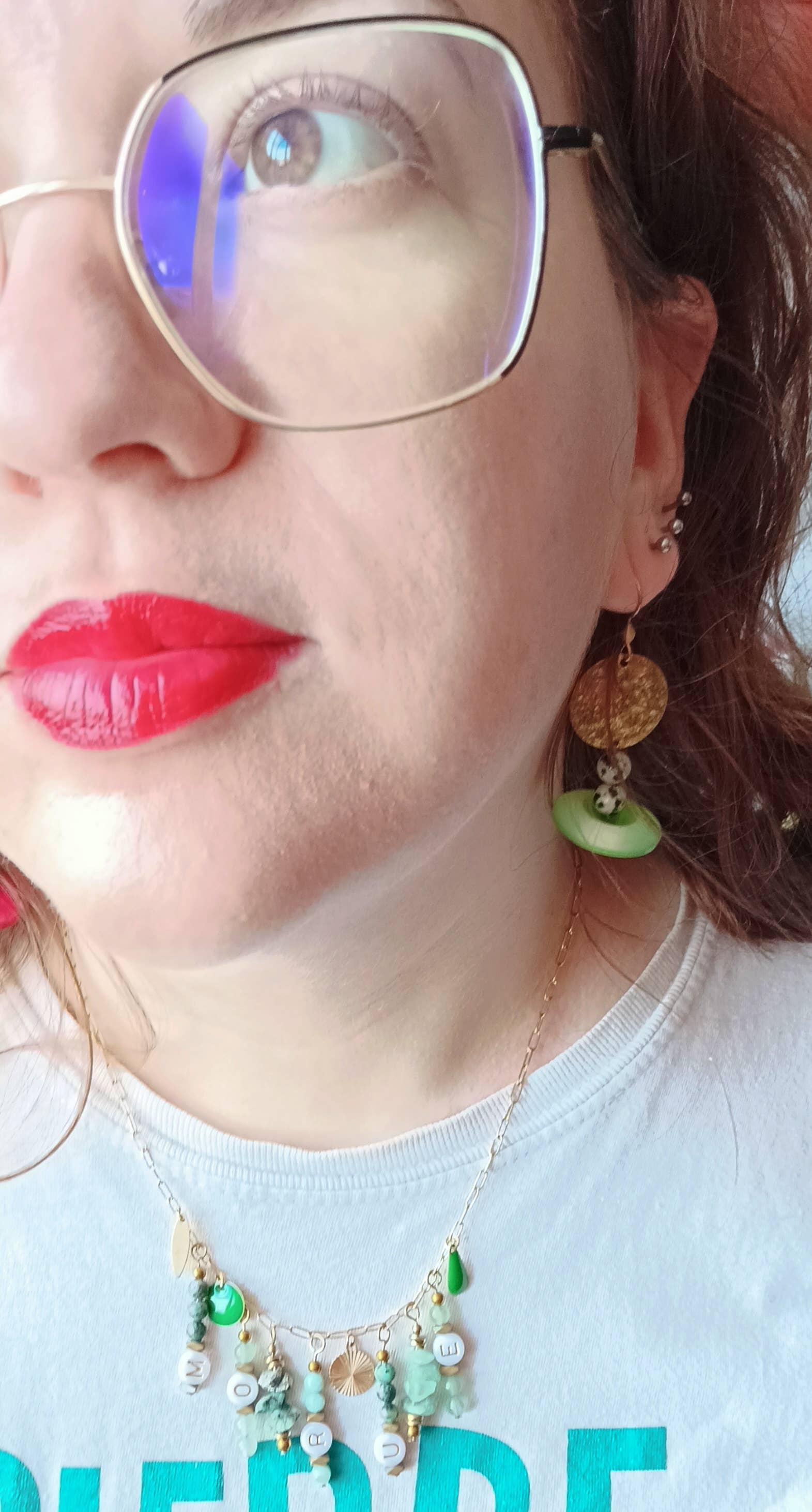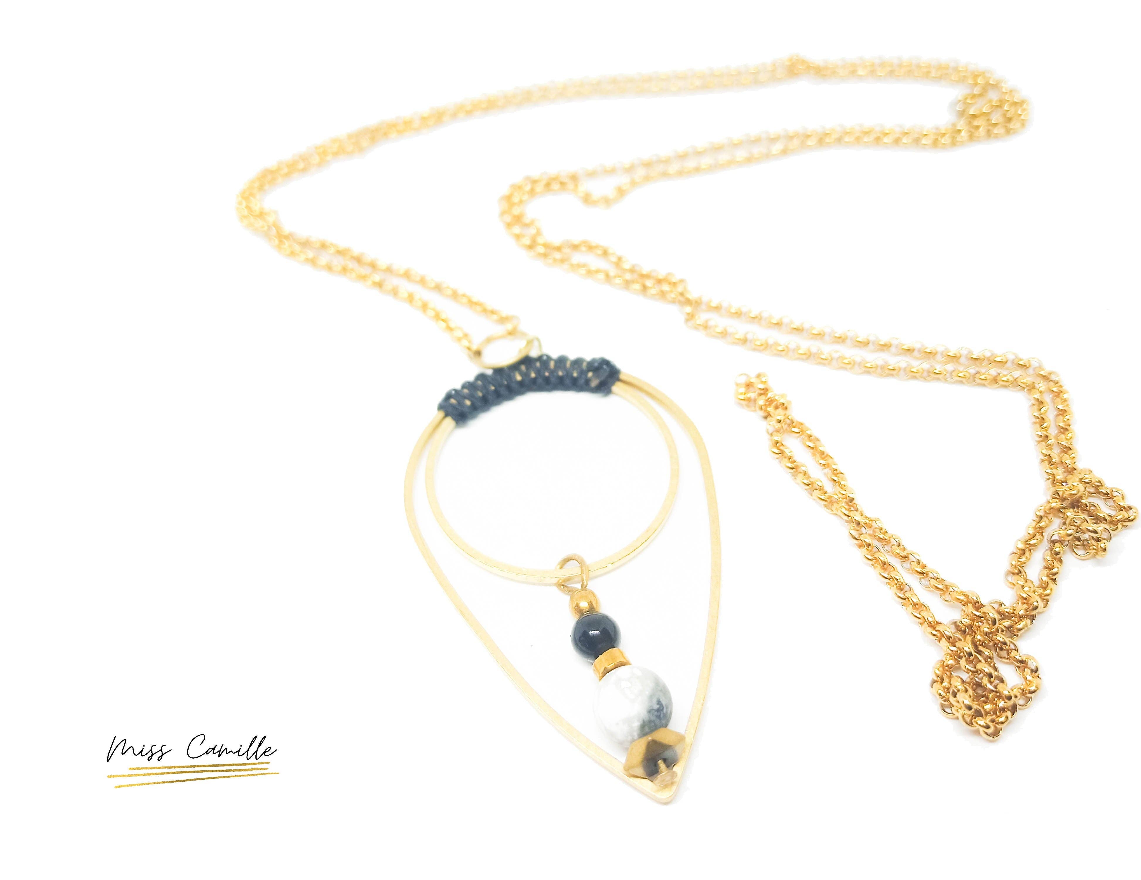 Short necklace in steel, macrame and stones. Short necklace with a round pendant available in two models: - green macrame, Dalmatian jasper bead and African turquoise, brass charm - red macrame, Dalmatian jasper pearl and red-tinted jade, brass charm Adjustable necklace measuring approximately 40cm, mounted with a gold steel chain. Fine and chic jewelry that reminds me of a mermaid tail. *colors may vary on photos