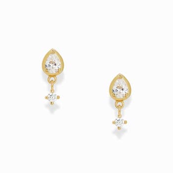 The Rex Draping Crystals Earring is adorned with multiple cubic zirconia crystals with delicate gold framing. With two posts you can drape crystals from one piercing to another for a very forward and edgy earring look. This earring is one single piece with a statement making look that all your friends will want. · 18k gold plated 925 sterling silver · Cubic zirconia crystals · Two stud posts. One on each end of earring.