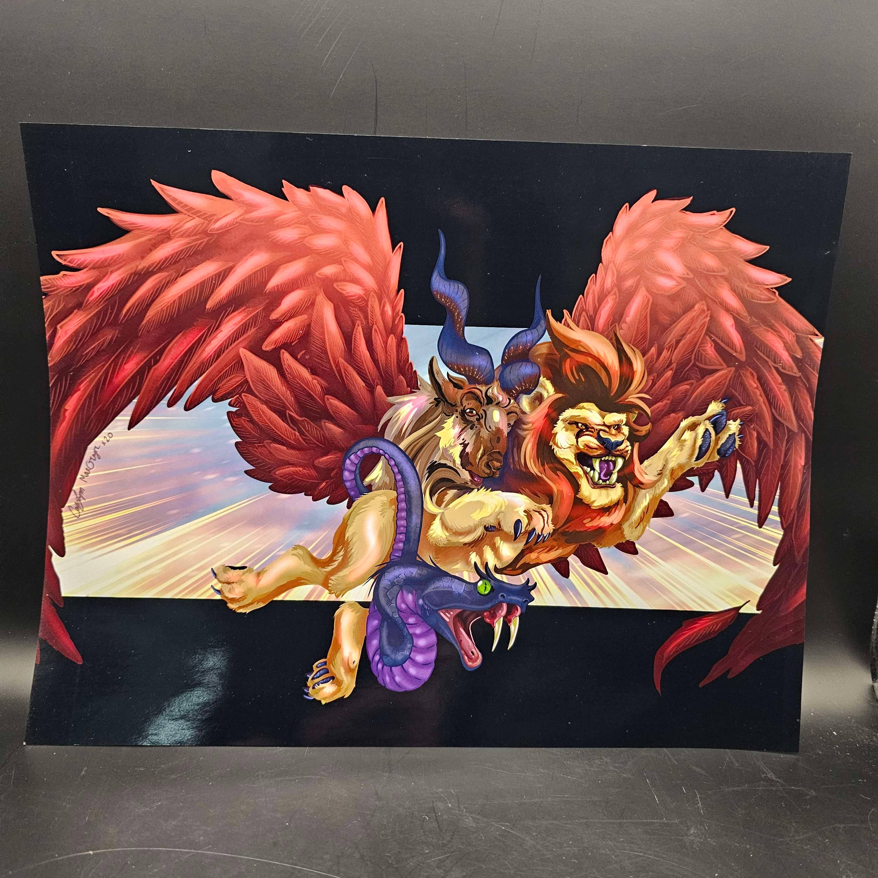 8.5 x 8.5 photo quality art print, this is an original art piece by Cassie AKA Dead and the piece is called "Hellhound & Heaven Dog" It depicts a A hellhound is a mythological creature, typically a supernatural dog, associated with the underworld or hell. They are often depicted as guardians of the gates of hell, servants of demons, or symbols of death. In Greek mythology, Cerberus is a well-known hellhound, a multi-headed dog guarding the entrance to Hades. The piece also depicts a Heaven Dog which is the counter part of the hellHound. In folklore and mythology, "heaven dogs" and "hellhounds" represent contrasting concepts related to the afterlife. Hellhounds, often monstrous or supernatural, are associated with the underworld and death, while "heaven dogs" are typically portrayed as loyal companions who join their owners in a blissful afterlife. The art print comes with a thick card stock backing and in a clear plastic sleeve.