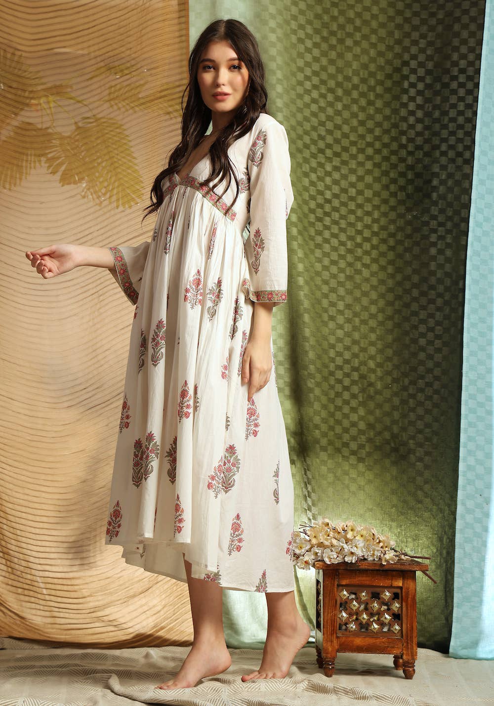 SKU: DAK-SM-WHI-VAS Made in India Aesthetic: Bohemian and Retro / vintage Care Instructions: Machine wash Color: Pink and White Dress Style: A-line Embellishment: Piping Fabric: 100% Cotton Fit: Contemporary Neckline: V-neck Occasion Theme: Baby Shower, Everyday, and Mother's Day Occasion: Day Party and Everyday Pattern: Floral Season: Spring/Summer Skirt & Dress Length: Midi Sleeve Length: 3/4 Sleeve Product Language: English Weight: 170.1 g (6 oz) Production: Ethically sourced and Fair trade