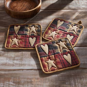 Enhance your kitchen's primitive and country appeal with the VHC Brands Cotton Pot Holder Set of 2 from the Heritage Farms Collection. These square 8x8-inch pot holders are not only heat-resistant but also boast a charming patchwork design, blending seamlessly with your rustic decor. The flat weave and deep burgundy color lend an authentic, farmhouse-inspired touch to your culinary space, making them a perfect choice for both style and functionality. Crafted with meticulous attention to detail, these pot holders are designed to protect your hands while providing a visually captivating element in your kitchen. The primitive charm and patchwork design evoke a sense of nostalgia and warmth, creating a cozy atmosphere. Whether you're cooking up a hearty meal or adding a touch of country sophistication to your kitchen, the VHC Brands Cotton Pot Holder Set of 2 is an ideal choice that effortlessly embodies the enduring charm of primitive and country living. The flat weave texture and deep burgundy color of these pot holders add a delightful rustic touch to your kitchen, seamlessly complementing the patchwork design. These pot holders are not only a stylish addition but also offer heat-resistant functionality, ensuring your hands stay safe while you create culinary delights. Elevate your kitchen's primitive and country aesthetic with these versatile and visually pleasing pot holders that perfectly capture the essence of rustic, down-home living. Includes: 2 x Pot Holder Care Instructions: Machine Wash, Tumble Dry Low, Iron Safe Material: 100% Cotton Shell, Cotton Batting