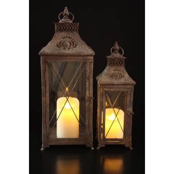 These metal lanterns have an antiqued bronze finish and clear glass panes on all sides. Their detailed touches and slim profile make them very versatile for many a garden, party, or wedding. Choose from our 13-inch bronze Mahal lantern or 16-inch Taj Square lantern, depending on your style. The Mahal lantern features six rectangular panels and a rounded base, while the Taj Square style has four glass panels and a wide, pointed base. Combine both antique Indian lanterns for a unique display and visual layering.