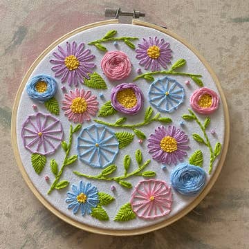 This gorgeous landscape embroidery craft kit is a fun, challenging project to get lost in. It features dynamic textures, surprising stitches, and rich colors. There is an online video tutorial to help guide stitchers, but I would not suggest this design for crafters new to hand embroidery. The embroidery kit includes: * Blue fabric, permanently stamped with the template * A 6 inch wood embroidery hoop * Hand embroidery needles * 18 colors of DMC cotton embroidery floss * Color printed embroidery pattern * A copy of the Beginner Guide The simple embroidery pattern includes a link to the video tutorial on YouTube, stitch and color keys and a color close up photo of stitched pattern.