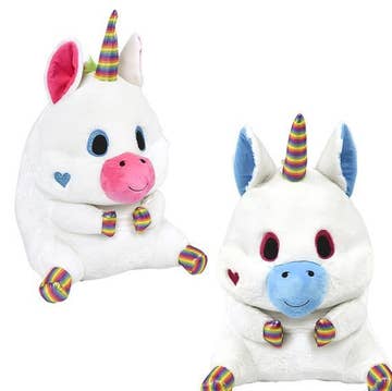 Unicorns are incredibly magical creatures. Here is a puffy looking unicorn that just loves eating rainbows and other magical things. You need more unicorns in your life brining magic to your day to day activities! Hug this soft little buddy and feel the magic! - Soft short fleece fabric and embroidered eye and mouth details. -10 inches tall, 14 inches long, 8 inches wide.