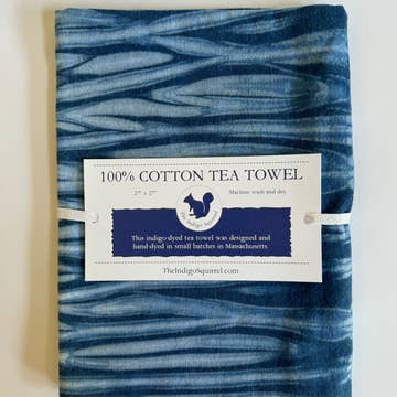 100% Cotton, indigo-dyed tea towel. This towel is long lasting, a work horse in the kitchen. Beautiful, yet durable. It will not bleed or fade when washed. A very giftable product. A generous 27" x 27". Machine wash and dry. Custom woven label and herringbone loop on reverse side. Made in small batches in Massachusetts. Each towel unit is unique.