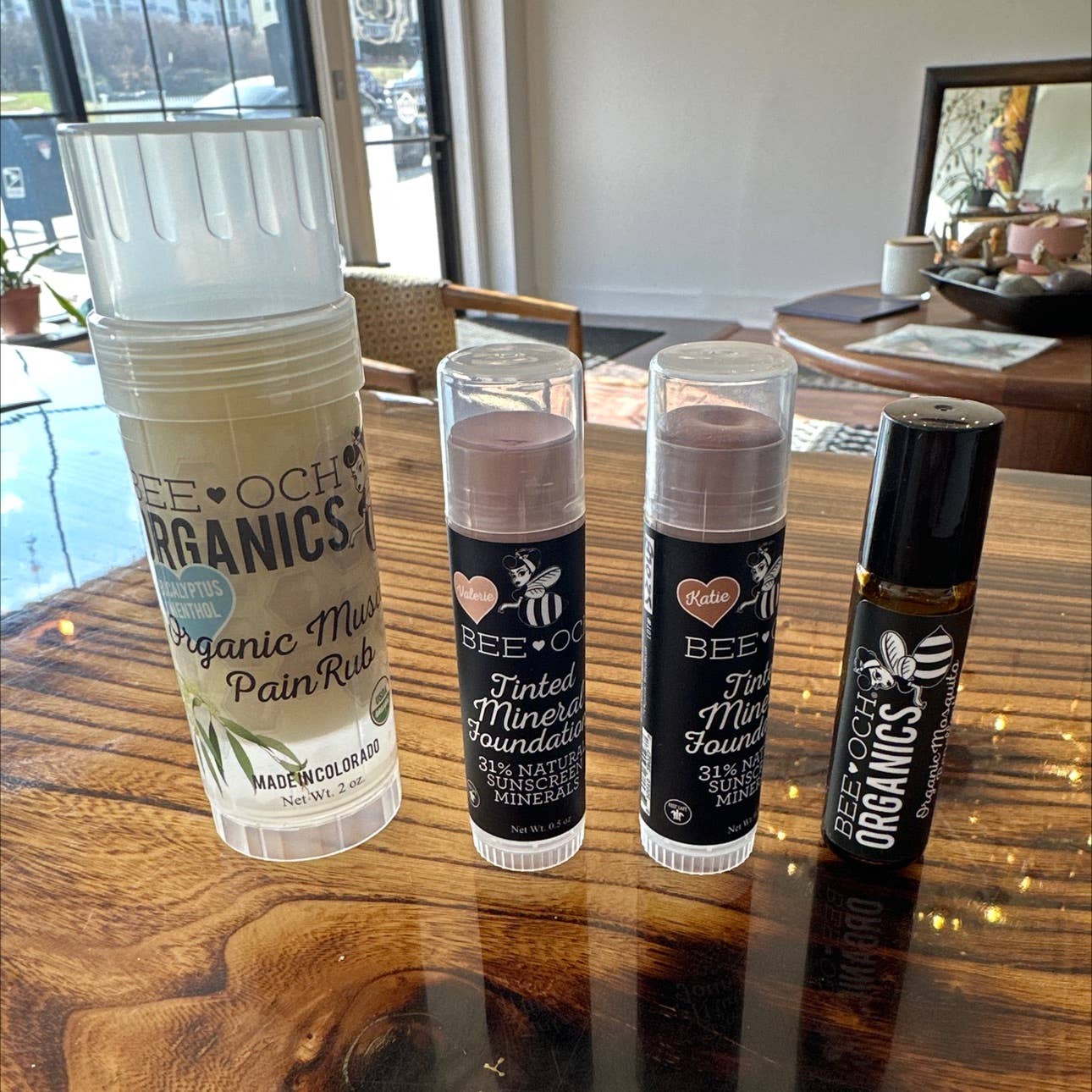The tinted spf sticks are hydrating with a sheer coverage, easy for clients to use and the tones work for all skin colors. The muscle pain rub is fantastic. Our clients are definitely excited about these products. We are only starting to warm up now so we haven’t given the mosquito repellent a try yet but I’m impressed so far.