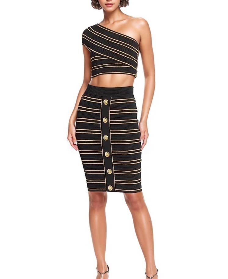 * Style No.: DS1240945G1 TWEED SIDE SLIT MIDI SKIRT SET - 2 Piece Skirt Set - Luxe Faux Leather Material - Plaid Pattern - Strapless Crop Top - Sweetheart Neckline - High Waisted Midi Skirt - Side Slit - Button Accents - Back Zipper Closure - 95% Polyester 5% Spandex