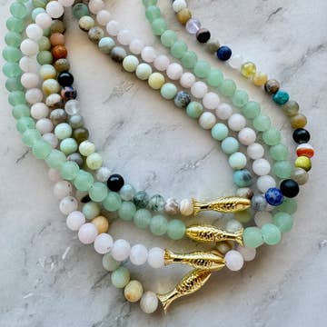 Ashia believes that each new day is a chance to be reborn. To be a better version of herself, to try new things, to make a difference in the world. Hand beaded matte gemstone necklace with gold fish detail. -Natural, unpolished gemstones in your choice of Aventurine, Rose Quartz, Amazonite, Mixed Gemstone, Lapis and Turquoise -All gold filled findings -Water safe -Total length 17"