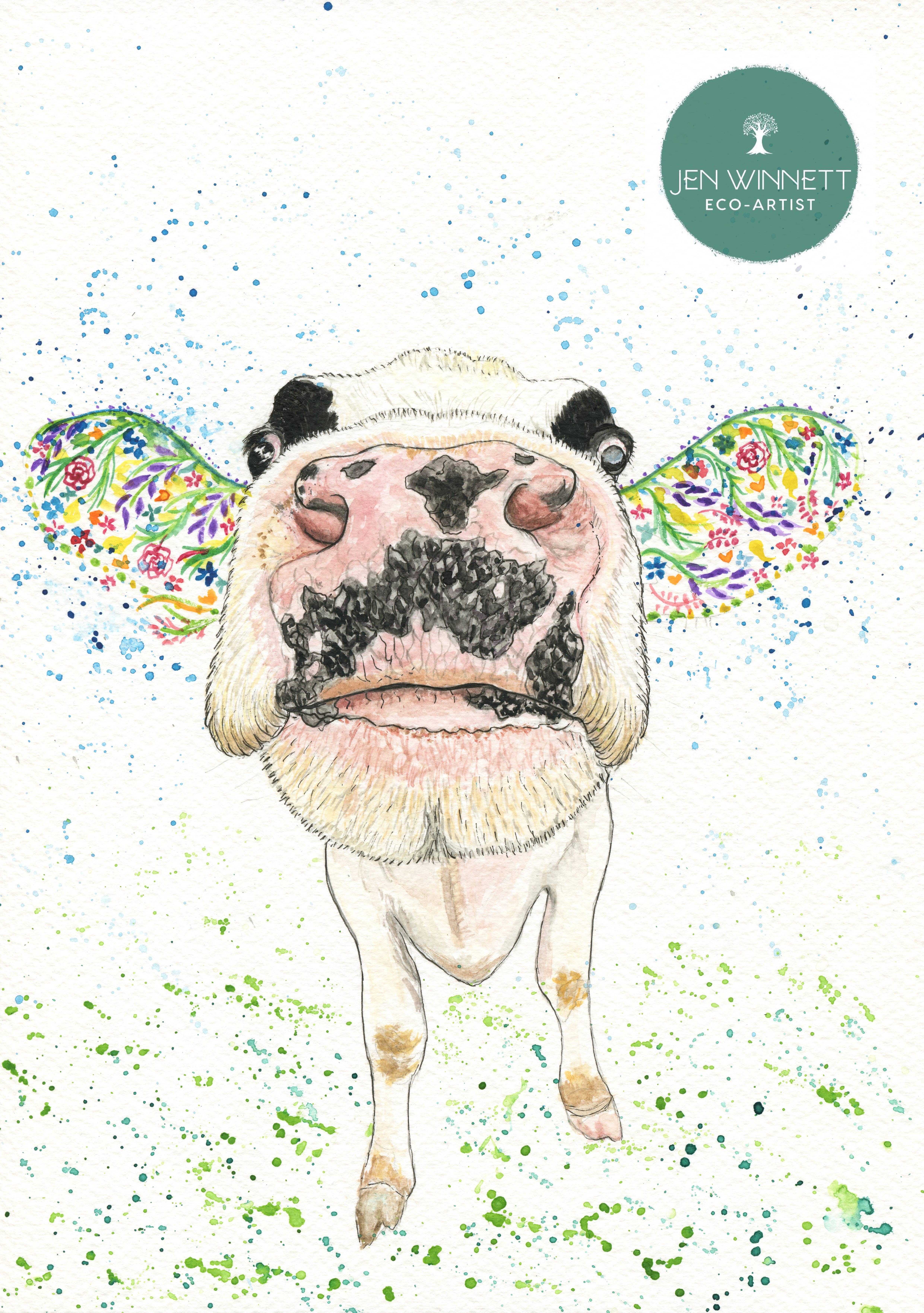 Clover the Cow | Signed Art Print | Animal | Artwork | Home | Farm | Nature | Kids| Art | Eco Friendly | Affordable | Jen Winnett Art | Flowers *Please note watermark is just to protect image online and is not printed on to print* This is a signed print of my original watercolour painting. The paper is a high quality 300gsm and the print comes packaged with a back board (made from recycled stock) and enclosed in a clear biodegradable corn starch protective slip