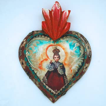Hand-formed tinwork featuring a raised, multi-piece Sacred Heart motif. Individually cut and shaped components are layered to create subtle depth and shadow while maintaining a clean, restrained profile rooted in traditional hojalata techniques. Designed for wall display, the brushed tin surface reflects light softly, allowing the heart and flame to emerge with quiet presence. Finished with a Studio Carta cotton ribbon edged with metallic thread. In milagro traditions, the Sacred Heart is associated with love, devotion, protection, and gratitude, often offered as a symbol of intention or reflection. Measures approx. 4.5” W × 0.5” D × 5.5” H. Packaged individually in a box measuring 5 3/8” × 7/8” × 7 3/8”. Handmade in Santa Fe, New Mexico.