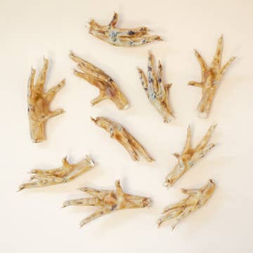 All Natural, dehydrated chicken feet. 12 month shelf life. Made in Georgia. 4 oz Pouch.